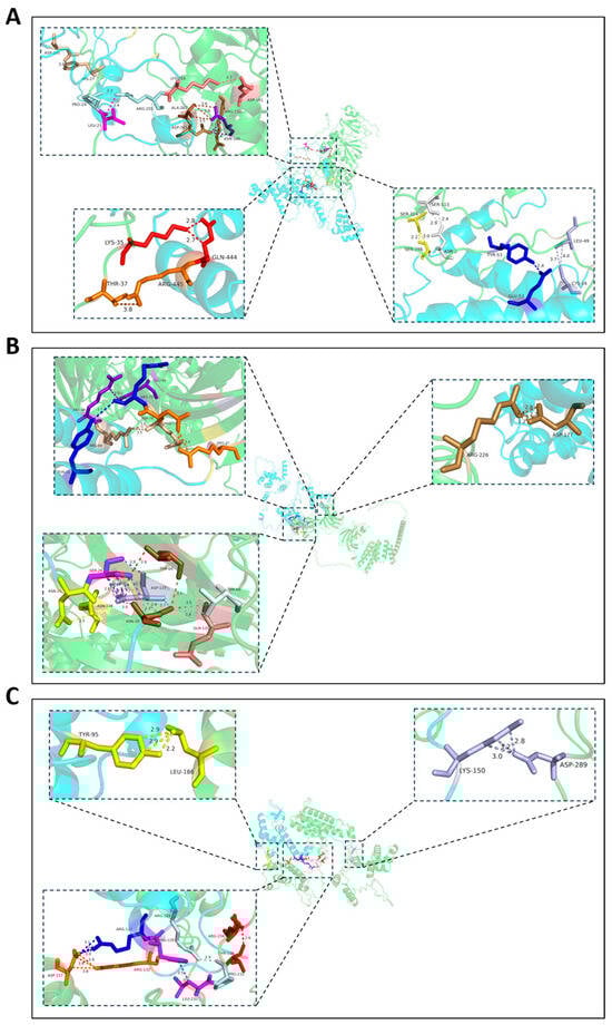 Three-dimensional structural modeling of proteins was performed using AlphaFold2 software v2.3.1 [28], followed by protein–protein docking with HDOCK software v1.1 [29,30] to obtain multiple protein–protein complex structures. These structures were sorted and screened based on their respective confidence scores. The protein–protein complex structure with the highest confidence score was selected as the target and imported into Pymol software v3.1 to analyze the protein–protein binding sites. According to the HDOCK Server (http://hdock.phys.hust.edu.cn/, accessed on 20 July 2025), a confidence score above 0.7 indicates a high likelihood of binding between the two molecules, a score between 0.5 and 0.7 suggests a possible binding interaction, and a score below 0.5 implies a low probability of binding.