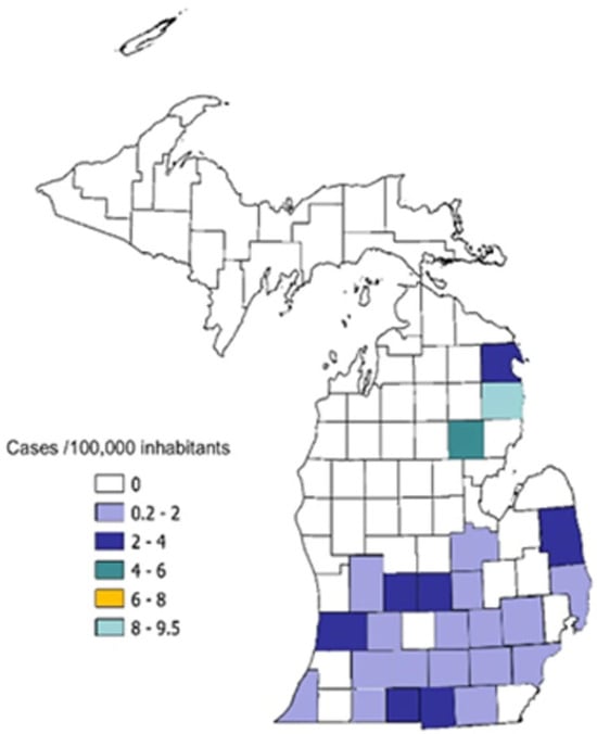 Geographical distribution of hospitalized patients in Michigan newly diagnosed with histoplasmosis by county of residence. Incidence rates are expressed as cases per 100,000 inhabitants, calculated using patient’s ZIP code at admission.
