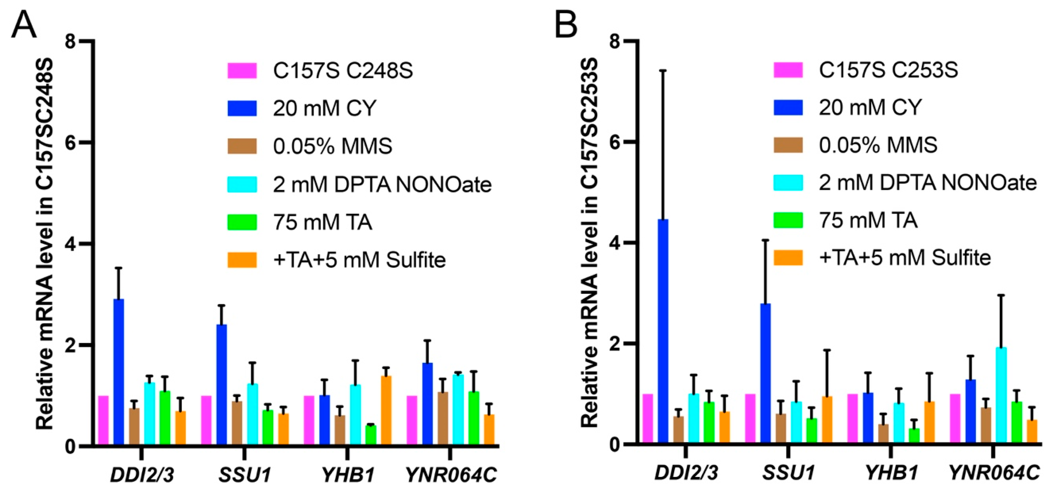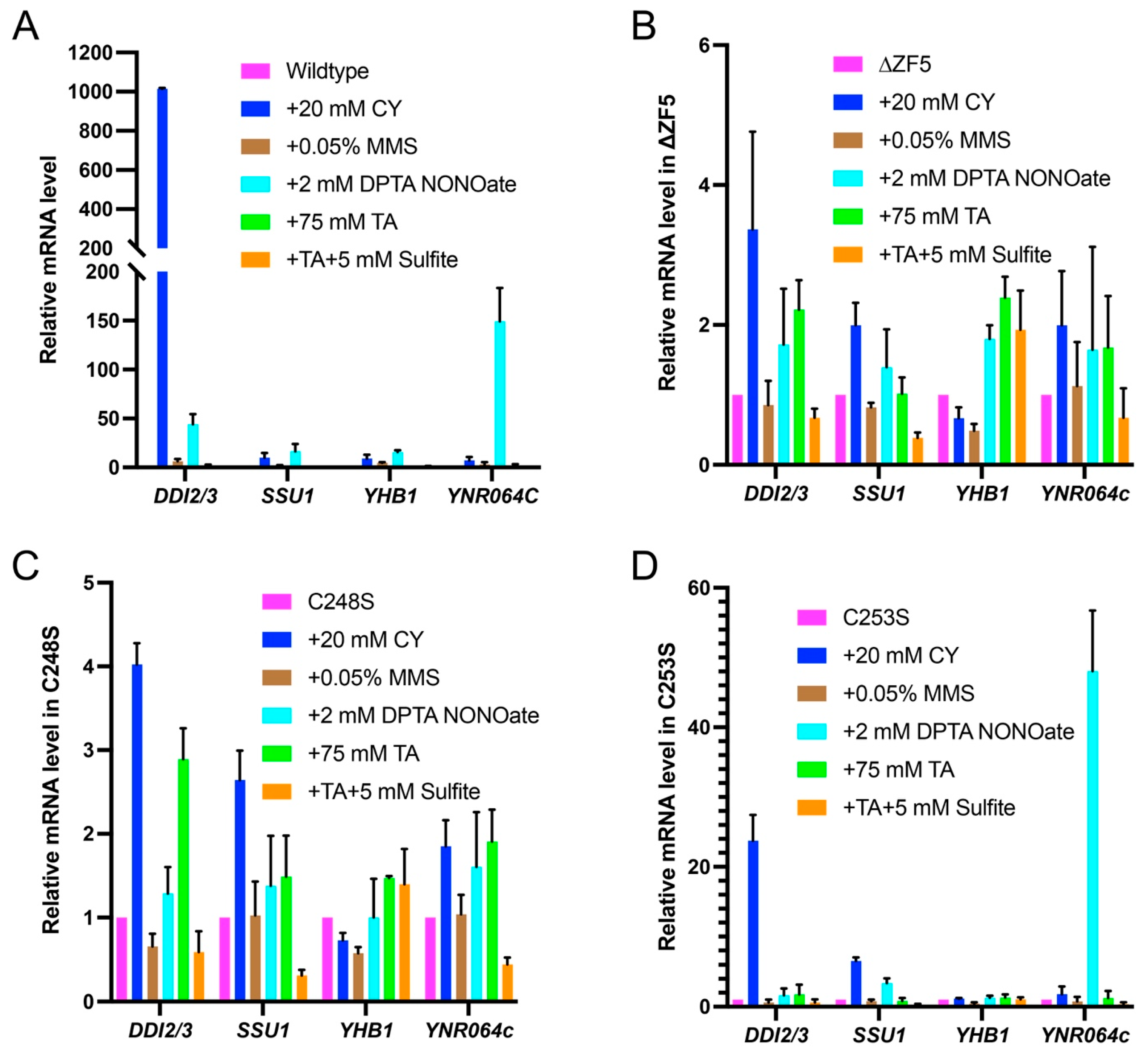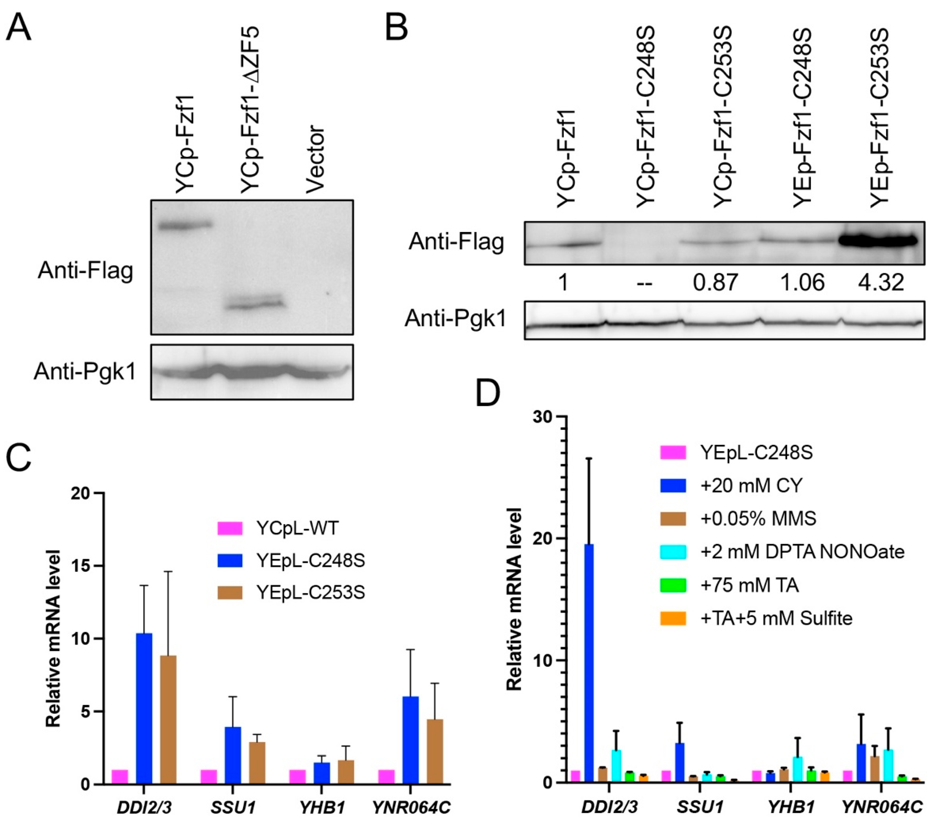 3.2. fzf1-C248S and fzf1-C253S Differentially Affect Fzf1-Regulated Gene Expressions in Response to Chemical Stresses