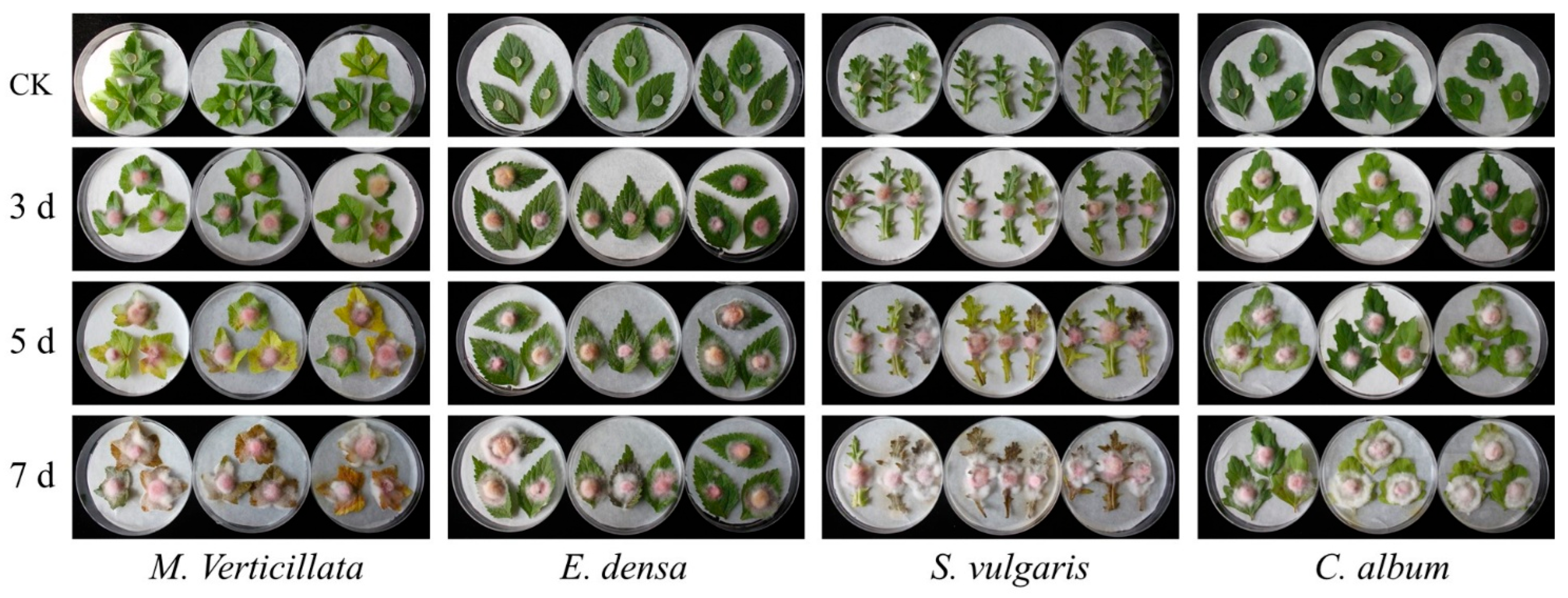 2.4. Pathogenicity Assay on Detached Leaves