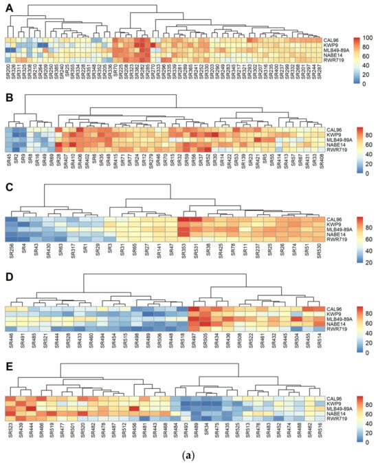Figure 4. (a) The heat map of DSI of different S. rolfsii strains. A to E are for experiments 1, 2, 3, 4, and 5, respectively. (b) The pre-emergency damping-off heat map of different S. rolfsii strains against the five common bean varieties. A to E are for experiments 1, 2, 3, 4, and 5, respectively.