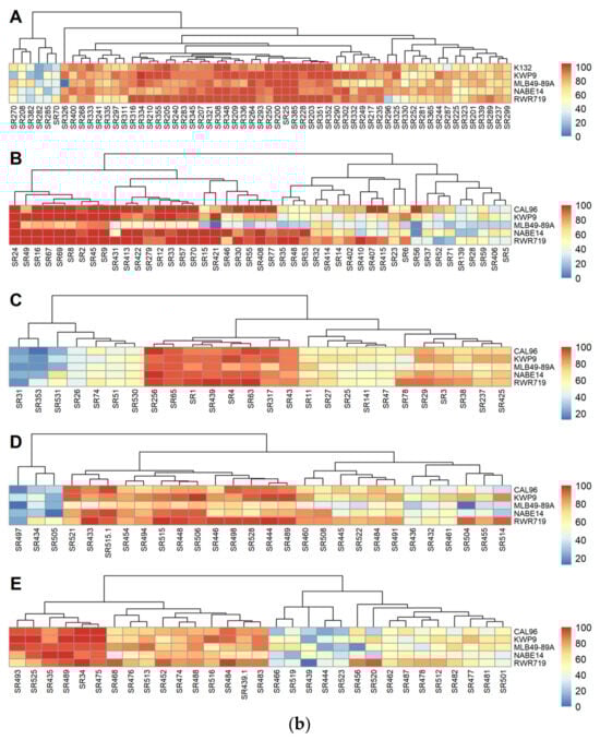 In experiment 3, there were no significant differences in DSI for the five common bean varieties screened (F = 2.4081, p = 0.2561). However, DSI was significantly different among common bean varieties in experiments 1 (F = 3.555, p = 0.007) 2 (F = 8.242, p = 0.02), 4 (F= 15.677, p < 0.0001), and 5 (F= 6.2736, p < 0.0001). Pairwise comparison of p values among the varieties within each experiment was conducted. In experiment 1, the DSI of CAL96 varied with that of KWP9, while in experiment 2, that of CAL96 and WKP9 and MLB49-89A and RWR719 differed. In experiment 4, the DSI of NABE14 and RWR719, NABE14 and KWP9, MLB49-89A and RWR719, MLB49-89A and KWP9, and CAL96 and RWR719 differed. In experiment 5, the DSI of NABE14 and RWR719, NABE14 and KWP9, and CAL96 and KWP9 differed (Table 4). A heat map was then generated for DSI caused by the different strains (Figure 4a). Overall, CAL96 was the most susceptible variety, with an average DSI of 54.2%, and RWR719, the most resistant, with an average DSI of 42.4%. The R2 values for variety were 0.02, 0.02, 0.03, 0.12, and 0.05 for experiments 1 to 5, respectively, while the R2 values for the tray effect were 0.32, 0.43, 0.36, 0.56, and 0.39 for experiments 1 to 5, respectively. When the data for all the experiments was pooled, there were significant differences in DSI on the different common bean varieties (F = 9.205, p < 0.0001). A pairwise comparison of p values revealed that the DSI of CAL96 and RWR719 differed.