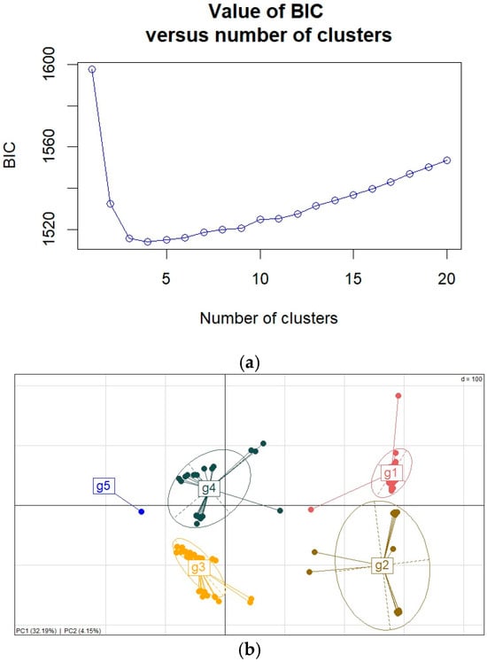 Figure 5. (a) Bayesian information content plot, (b) clustering of S. rolfsii strains using principal component analysis based on two principal components.
