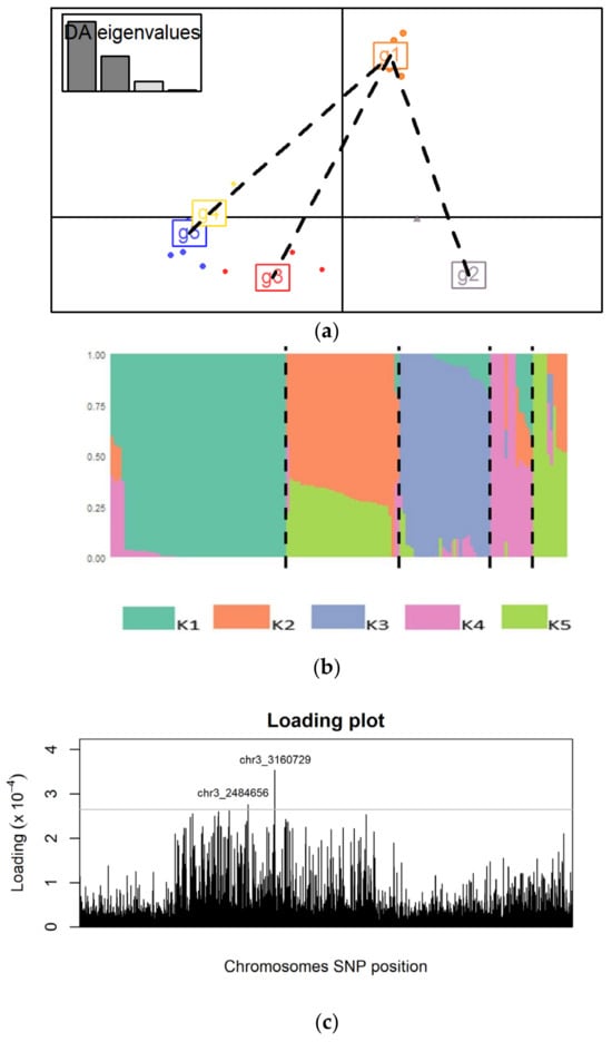 Figure 6. (a) A scatter plot of the different genetic clusters showing separation of the clusters by the different axes, (b) proportions of S. rolfsii strains ancestry assigned to K populations, and (c) the loading plot showing SNPs associated with the genetic clusters. The loading threshold was set at 0.00027.