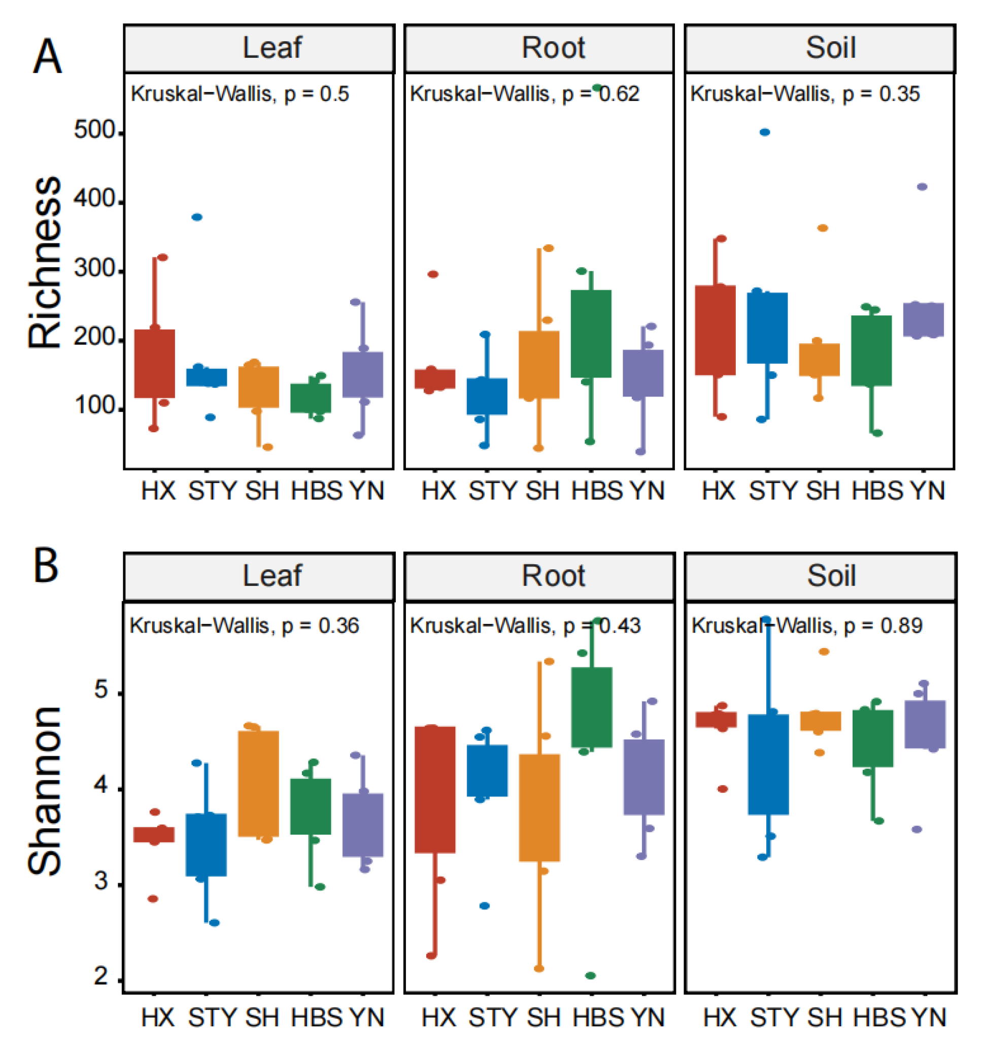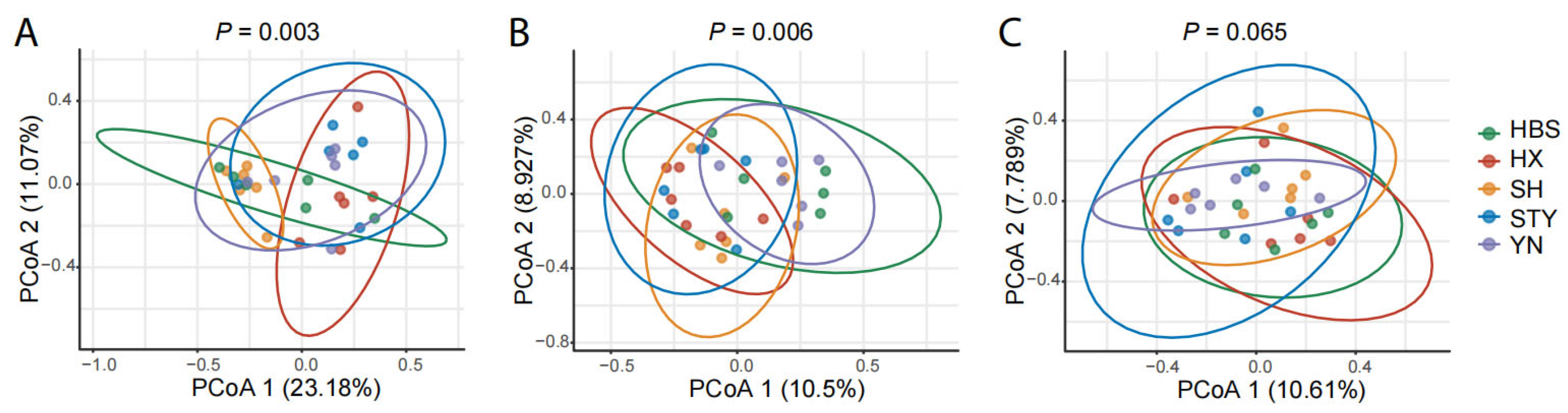 - Xing, Y.; Bian, C.; Xue, H.; Song, Y.; Men, W.; Hou, W.; Yang, Y.; Cai, Q.; Xu, L. The effect of plant compartment and geographical location on shaping microbiome of Pulsatilla chinensis. Appl. Microbiol. Biotechnol. 2023, 107, 5555–5567. [Google Scholar] [CrossRef]