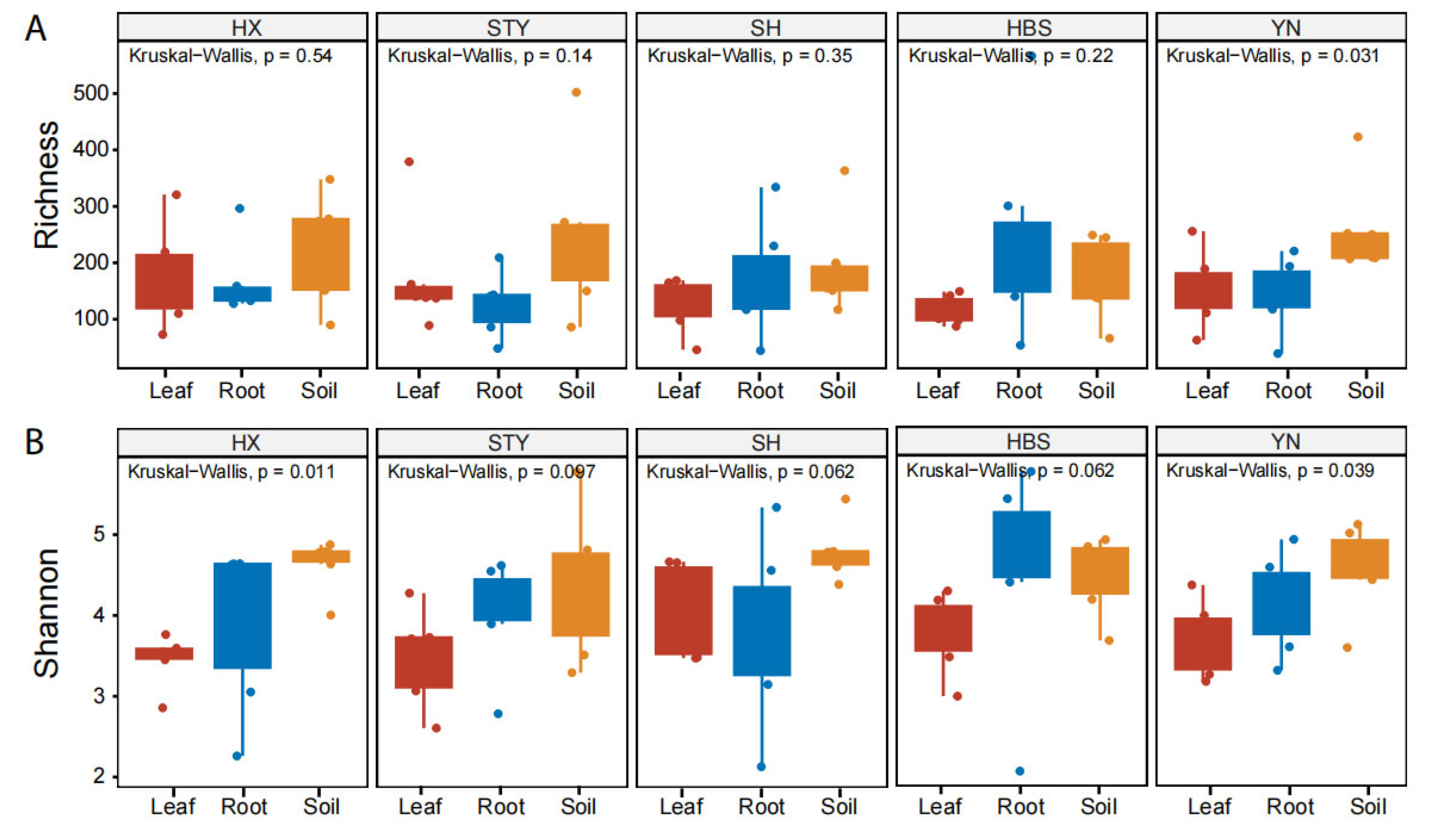 - Tan, X.; Xie, H.; Yu, J.; Wang, Y.; Xu, J.; Xu, P.; Ma, B. Host genetic determinants drive compartment-specific assembly of tea plant microbiomes. Plant Biotechnol. J. 2022, 20, 2174–2186. [Google Scholar] [CrossRef]