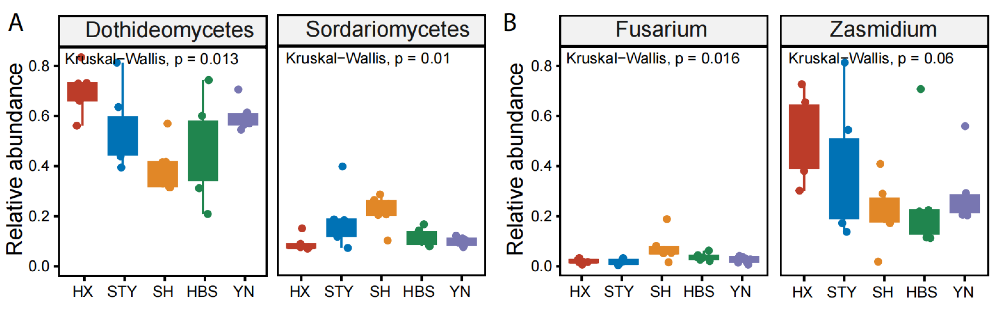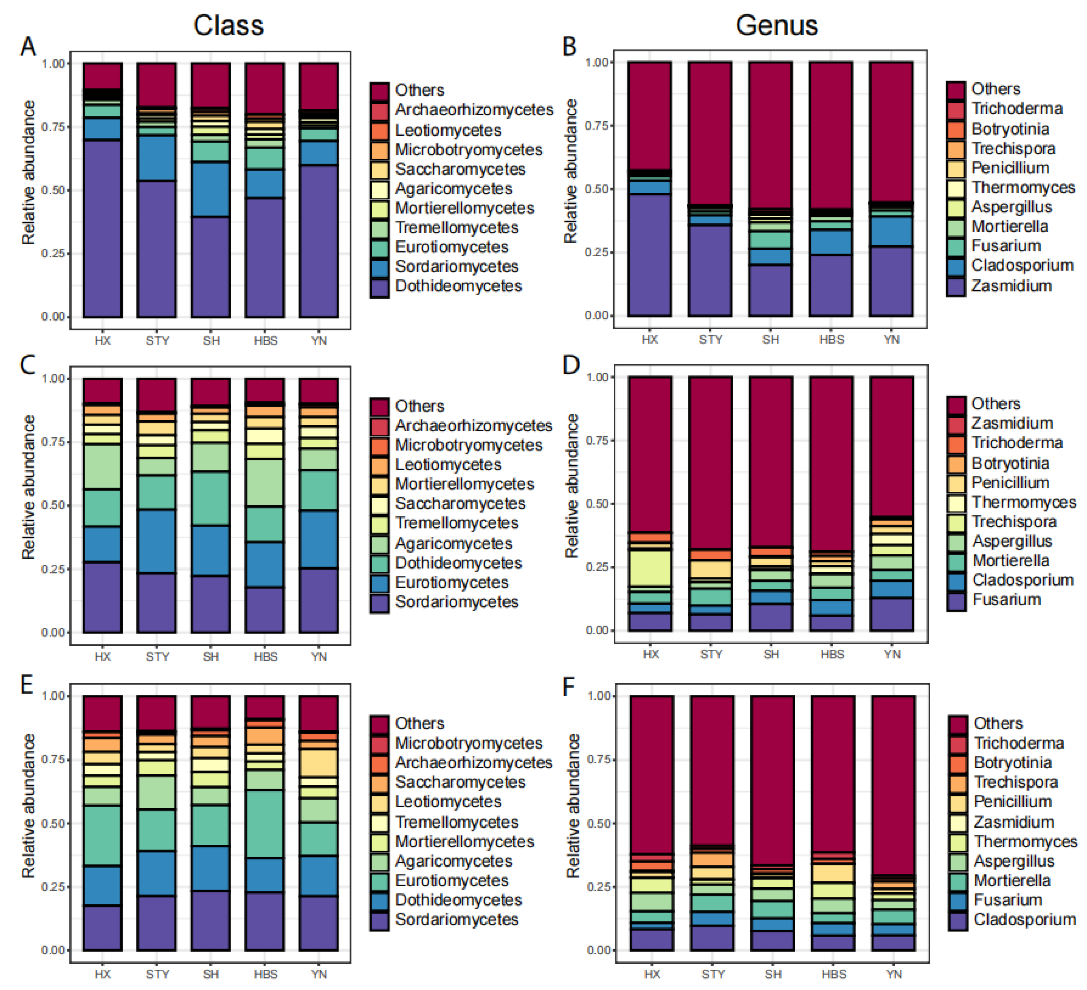 4.1. Variety Is Not a Significant Factor Affecting the Richness and Diversity of Pummelo Endophytic Mycobiota