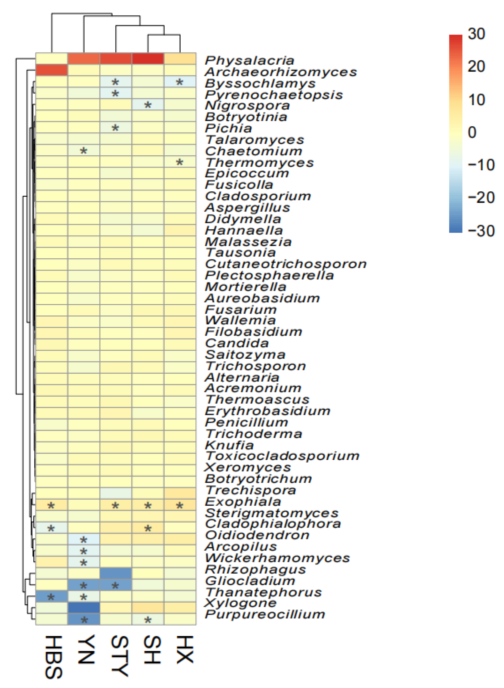 4.3. The Dominant Fungi Are Differentially Distributed in Different Pummelo Varieties