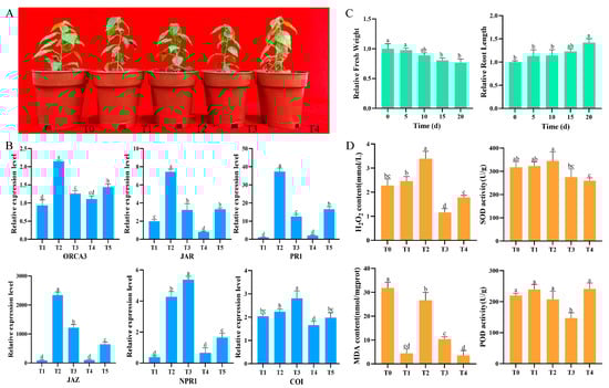 Effects of Botryosphaeria dothidea inoculation on morphological and physiological characteristics of Populus davidiana × P. alba var. pyramidalis. (A) Plant phenotypic progression. Left to right: Phenotypes at T0 (0 h), T1 (6 h), T2 (12 h), T3 (24 h), T4 (48 h), and T5 (96 h) post-inoculation (three plants per group). (B) Expression levels of two defense-related genes (NPR1 and PR1) from salicylic acid signaling pathway and four genes (JAR1, COI1, JAZ, and ORCA3) from jasmonic acid signaling pathway in plants. (C) Relative fresh weight and relative root length. (D) H2O2 content, SOD (superoxide dismutase) activity, POD (peroxidase) activity, and MDA (malondialdehyde) content in plant leaves. Error bars indicate standard deviation of three independent biological replicates. Significant differences between groups (p < 0.05), determined by Student’s t-test, are denoted by different lowercase letters.