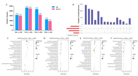 Differentially expressed genes and functional enrichment analysis of Populus davidiana × P. alba var. pyramidalis during Botryosphaeria dothidea inoculation. (A) Statistics of DEG numbers in different comparison groups. (B) UpSet plot illustrating DEG quantities across comparison groups. (C–F) KEGG pathway enrichment analysis of DEGs (B6h_vs_B0h, B12h_vs_B0h, B24h_vs_B0h, B48h_vs_B0h). Time point notation: B0h (0 h post-inoculation), B6h (6 h), B12h (12 h), B24h (24 h), B48h (48 h). Data represent three biological replicates per group (n = 3), with each replicate corresponding to individual plant.