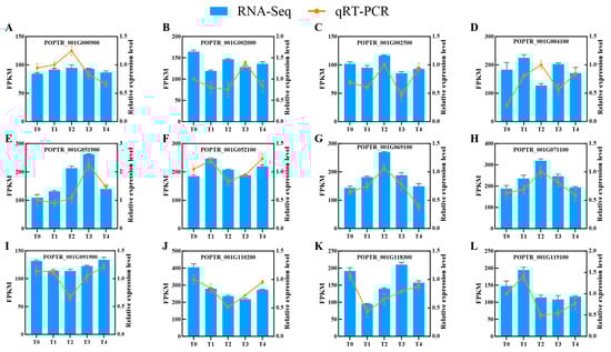 Validation of transcriptome data by RT-qPCR. (A-L): Twelve randomly selected genes from Botryosphaeria dothidea-inoculated Populus davidiana × P. alba var. pyramidalis were analyzed. Yellow bars denote RT-qPCR results (fold change); blue bars represent RNA-seq FPKM values. Time points: T0 (0 h), T1 (6 h), T2 (12 h), T3 (24 h), T4 (48 h) post-inoculation (n = 3 plants per group). Error bars indicate mean ± SE from three independent biological replicates.