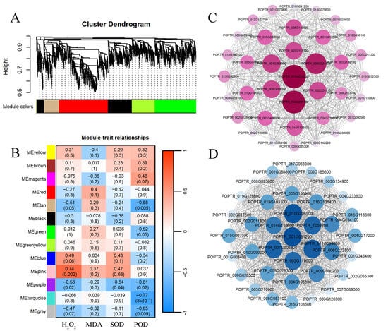 Weighted Gene Co-expression Network Analysis of differentially expressed genes in Botryosphaeria dothidea-inoculated Populus davidiana × P. alba var. pyramidalis. (A) Cluster dendrogram of DEGs. (B) Module–trait relationship heatmap of 13 co-expression modules. (C) Hub gene co-expression interaction networks in pink module. (D) Hub gene co-expression interaction networks in turquoise module. Data derived from three biological replicates.