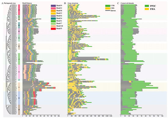 Genomic structural characterization of 124 Protein Phosphatase 2C genes in Populus trichocarpa. (A) Motif pattern analysis. Different colored boxes represent different motifs. (B) Gene structure analysis. Yellow boxes represent coding sequences (CDSs); green boxes indicate untranslated regions (UTRs); black lines denote introns. (C) Conserved domain analysis. Subgroup classification of genes was determined by phylogenetic tree analysis.