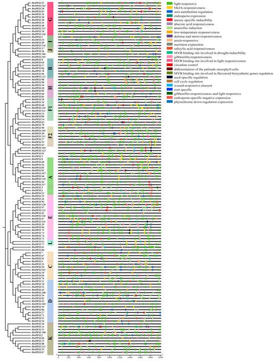 Analysis of cis-acting elements in promoter regions of 124 Protein Phosphatase 2C genes in Populus trichocarpa. Different colors indicate distinct types of cis-acting elements. Colored boxes represent specific heatmap modules. Color gradient in heatmap reflects relative abundance of cis-acting elements per gene. Red color lump represents high expression quantity; blue color lump means low expression quantity. Subgroup classification of genes was determined by phylogenetic tree analysis.