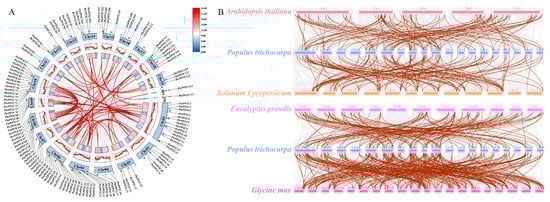 Collinearity analysis of Protein Phosphatase 2C genes in Populus trichocarpa. (A) Intrachromosomal syntenic relationships of PtrPP2Cs. Blue blocks denote chromosomes. Red lines indicate syntenic pairs of PtrPP2Cs. Gray lines represent background syntenic references across P. trichocarpa genome. Chr1-19 corresponds to chromosomes 1–19. (B) Synteny analysis between PtrPP2Cs and orthologs from four plant species (Glycine max, Eucalyptus grandis, Solanum lycopersicum, and Arabidopsis thaliana). Brown lines connect syntenic PtrPP2C–ortholog pairs, while gray lines depict genome-wide orthologous synteny between P. trichocarpa and compared species.