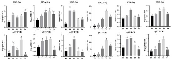 Expression analysis of selected Protein Phosphatase 2C genes in Populus davidiana × P. alba var. pyramidalis via RNA-seq and qRT-PCR. RNA-seq expression was quantified as FPKM. T0, T1, T2, T3, and T4 denote 0, 6, 12, 24, and 48 h post-Botryosphaeria dothidea inoculation, respectively. Error bars represent standard errors of three biological replicates (one plant per replicate). Intergroup differences were assessed by Student’s t-test with significance threshold of p < 0.05; distinct lowercase letters indicate statistically significant differences (p < 0.05).