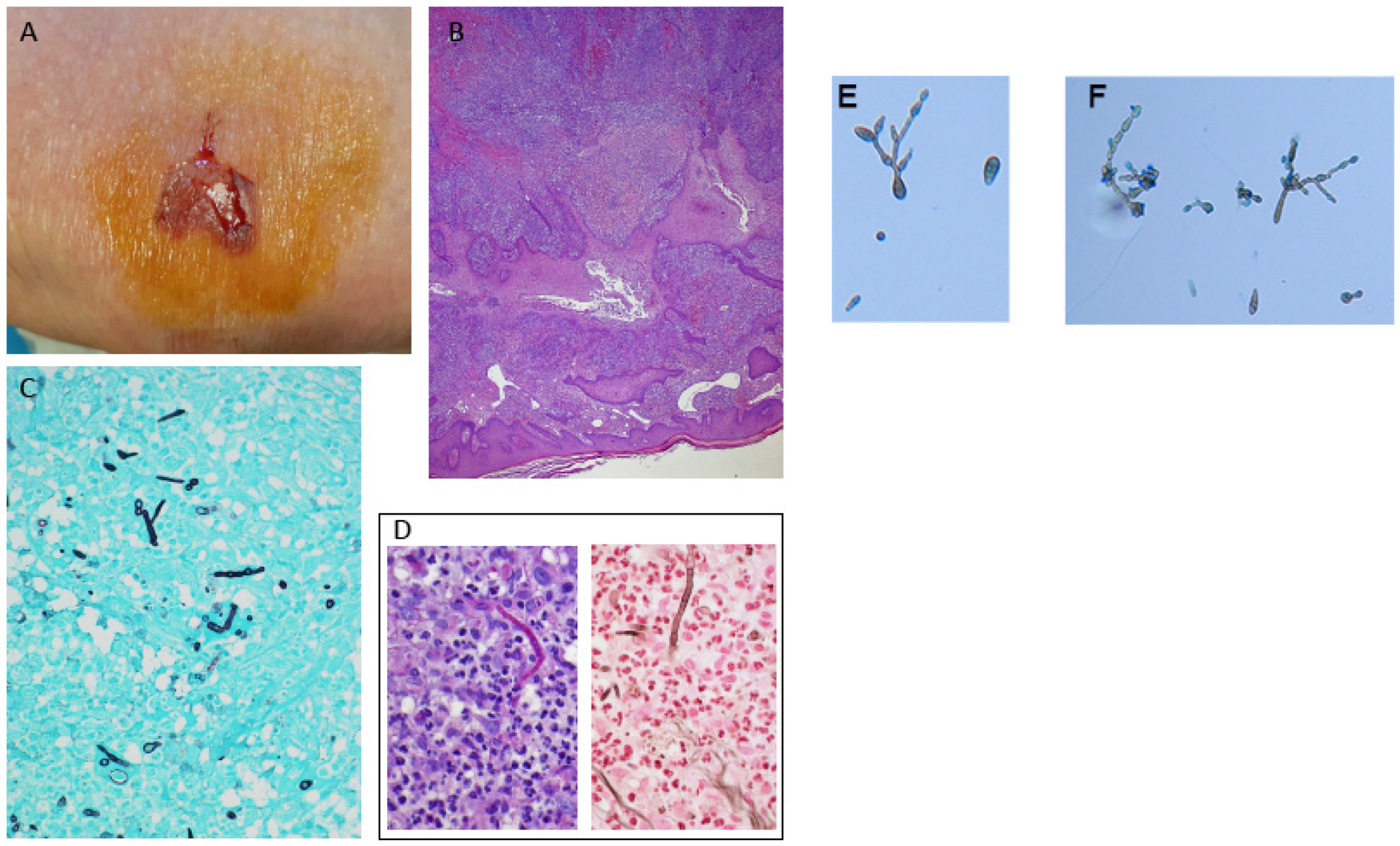 - Liu, A.W.; Bateman, A.C.; Greenbaum, A.; Garvin, K.; Clarridge, J.; Grim, J. Cutaneous Phaeohyphomycosis in a Hematopoietic Stem Cell Transplant Patient Caused by Alternaria Rosae: First Case Report. Transpl. Infect. Dis. 2017, 19, e12698. [Google Scholar] [CrossRef] [PubMed]