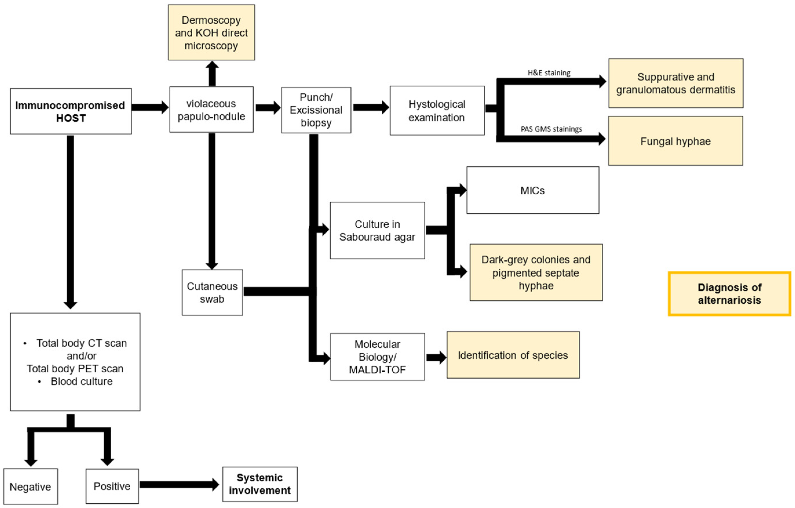 - Kim, J.O.; Kim, G.H.; Kim, B.C.; Lee, K.S. Cutaneous Alternariosis in a Renal Transplant Recipient. Int. J. Dermatol. 2003, 42, 630–631. [Google Scholar] [CrossRef]