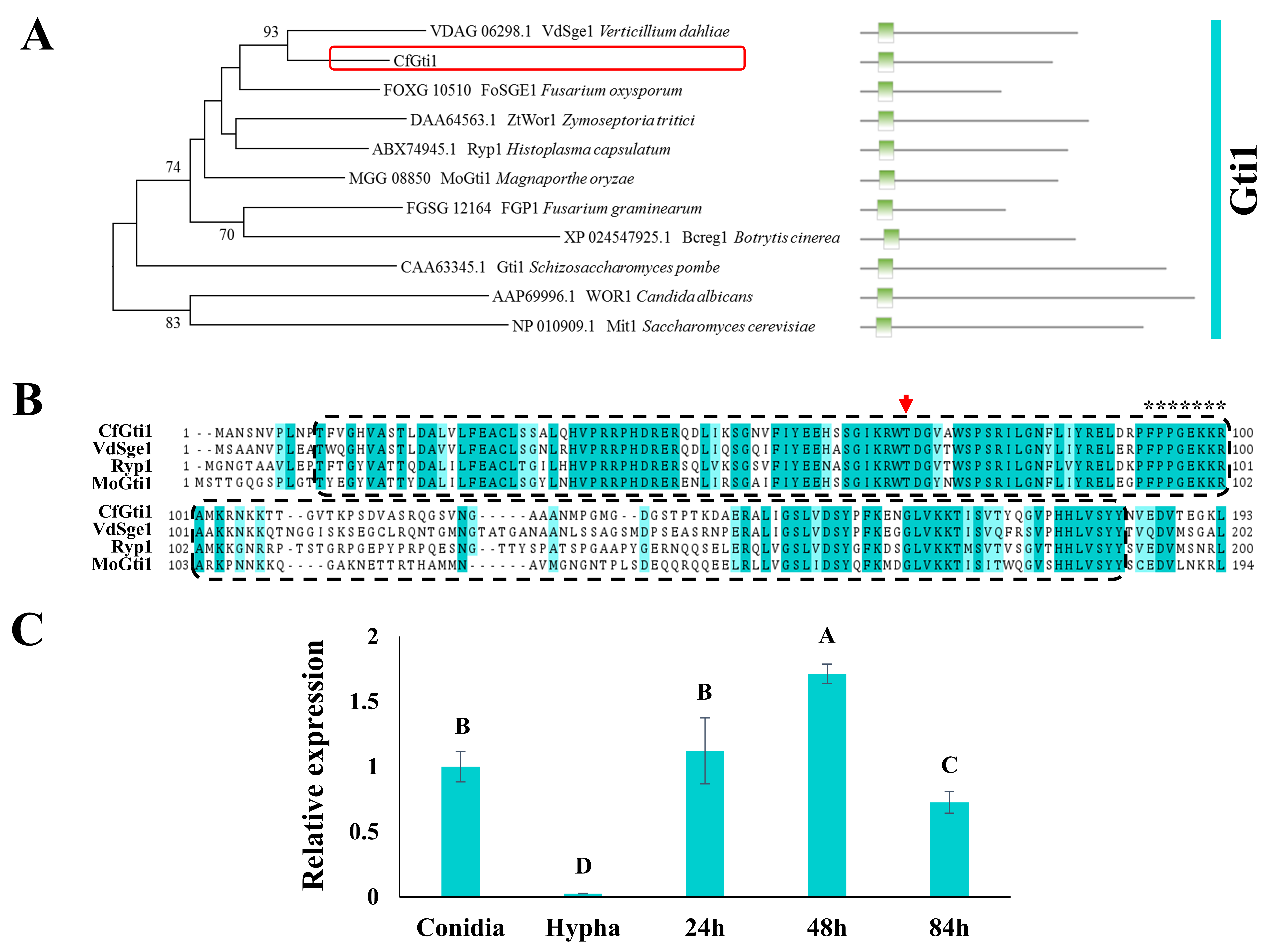 Figure 1. Phylogenetic and structural domain analysis and gene expression pattern analysis. (A): Phylogenetic analysis of CfGti1 and Gti1 orthologs in selected fungi. The corresponding sequence length and domain location are shown on the right. Gti1/Pac2 domains are indicated as green rectangles. The phylogenetic tree was constructed using 1000 non-parametric bootstrap runs with the neighbor-joining method; bootstrap percentages over 50% are indicated at the nodes. (B): Multiple amino acid sequence alignments of the N-terminal region of CfGti1 and its orthologs from Verticillium dahliae VdSge1 (XP_009656971.1), Histoplasma capsulatum Ryp1 (ABX74945.1), and Magnaporthe oryzae MoGti1 (XP_003713871.1). The red arrow indicates the conserved threonine residue within the potential protein kinase A phosphorylation site, and the putative nuclear localization signal is marked by asterisks. The box with the dashed line indicates the Gti1/Pac2 domains. Conserved residues are shaded in aquamarine. (C): Relative transcript level of CfGti1 gene at five developmental stages including conidia, hyphae, 24 h post-inoculation (hpi), 48 hpi, and 84 hpi on apple leaves. Error bars represent the standard deviation from three technical repetitions. The data were analyzed using Tukey’s HSD test. Means associated with the same capital letter do not differ significantly (p > 0.05).
