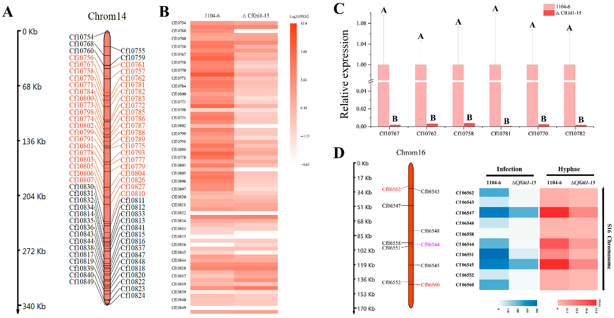 Figure 5. The expression pattern of genes on accessory chromosomes was affected after deletion of CfGti1. (A): Gene distribution map of the 14th accessory chromosome according to third-generation genome sequencing and assembly. Genes shown in red were sharply down-regulated in ΔCfGti1-15 compared to WT in vegetative hyphae. (B): The heat map indicates the gene transcript levels of the 14th accessory chromosome based on the FPKM value of vegetative hyphae from three technical repetitions. (C): Fluorescence qPCR of six selected genes was used to verify the transcriptome data of the 14th accessory chromosome. Error bars represent the standard deviation from three technical repetitions. Clustered means associated with different capital letters differ significantly (p ≤ 0.05). (D): Gene distribution of the 16th accessory chromosome and gene transcript levels of infection (72 hpi on apple leaves) and vegetative hyphae. Two genes with red color are salicylate synthetase ybtS and MaSalS ortholog; the gene with purple color is acyl-CoA ligase AKT1 and AFT1-1 ortholog. The transcriptome data of infection were derived from a pooled sample of four independent samples, while the transcriptome data of vegetative hyphae were obtained from three independent biological replicates.