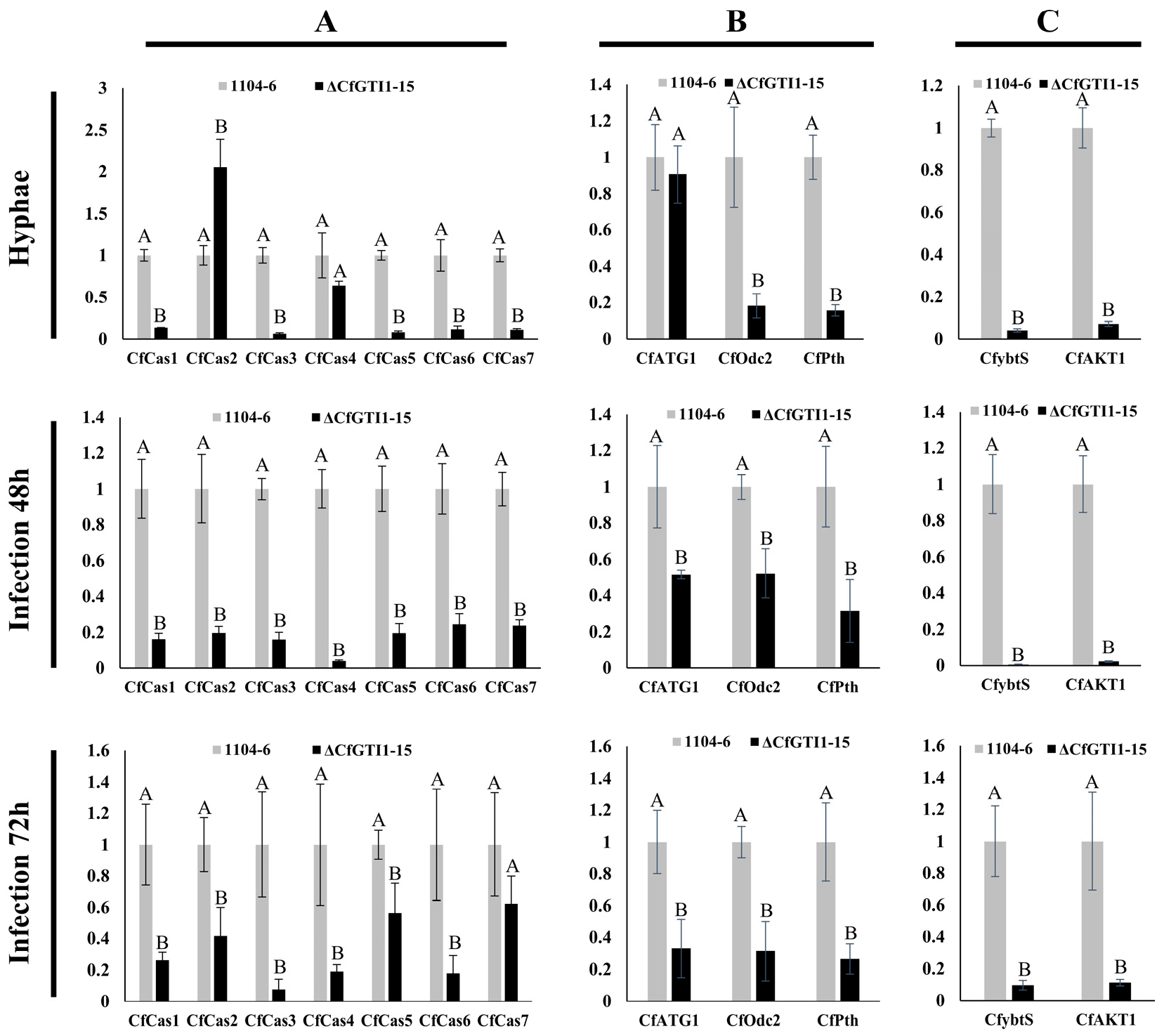 Figure 6. Fluorescence qPCR of orthologues of pathogenicity-related genes during vegetative hyphae, leaf infection at 48 h, and leaf infection at 72 h in C. fructicola. (A): Relative expression of seven Gas1-like DUF3129 family genes that are required for appressorium-mediated penetration in three phases. (B): Relative expression of three penetration-related genes in three phases. (C): Relative expression of two putative virulence-related genes that reside in 16th accessory chromosomes in three phases. Error bars represent the standard deviation from three technical repetitions. Clustered means associated with the same capital letters do not differ significantly (p > 0.05).