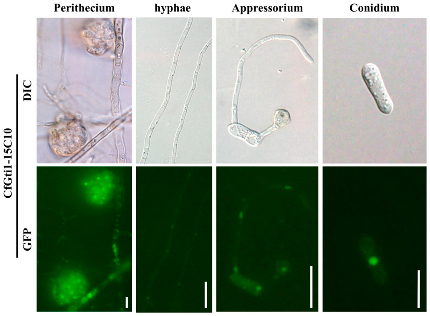 Figure 7. Subcellular localization of CfGti1-GFP. Fluorescence microscopy of CfGti1-GFP in conidia, appressoria, hyphae, and perithecia. Conidia and hyphae were harvested from 4-day-old PDB cultures. Bar = 20 μm. Appressoria were observed on cellophane 18 h after inoculation with a conidial suspension. Bar = 20 μm. Perithecia were obtained from 7-day-old oatmeal agar cultures. Bar = 20 μm. The fluorescence of protein was localized mainly in the nucleus.