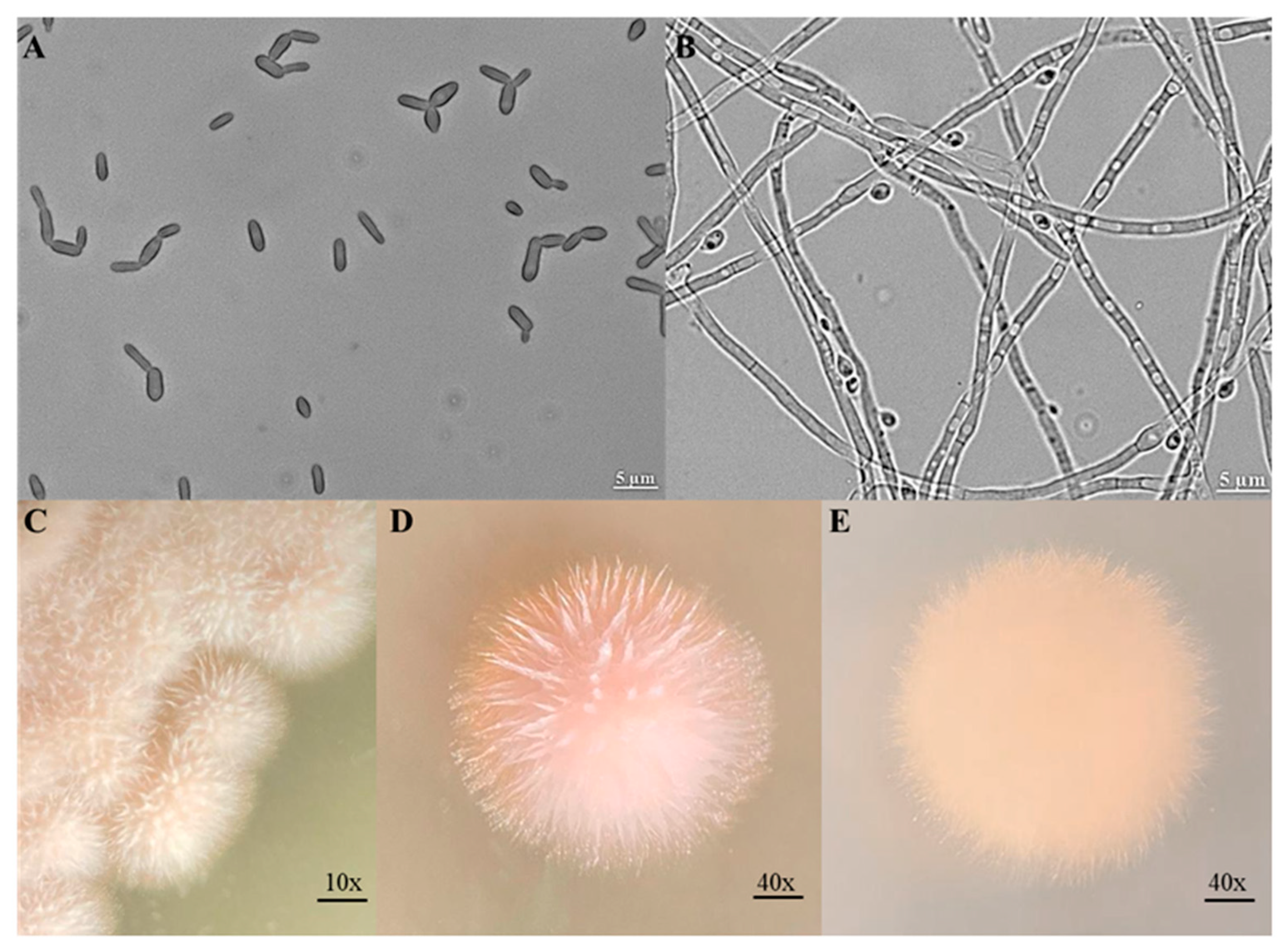 - Zheng, F.; Gao, W.; Wang, Y.; Chen, Q.; Zhang, Q.; Jiang, X.; Hou, B.; Zhang, Z. Map of dimorphic switching-related signaling pathways in Sporothrix schenckii based on its transcriptome. Mol. Med. Rep. 2021, 24, 646. [Google Scholar] [CrossRef]
