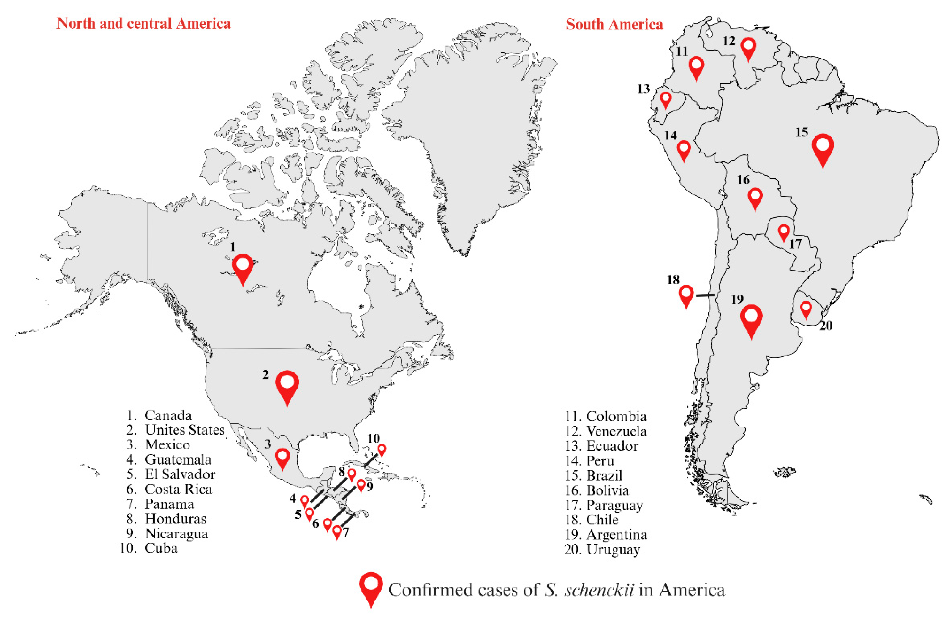 - Hernández-Castro, R.; Pinto-Almazán, R.; Arenas, R.; Sánchez-Cárdenas, C.D.; Espinosa-Hernández, V.M.; Sierra-Maeda, K.Y.; Conde-Cuevas, E.; Juárez-Durán, E.R.; Xicohtencatl-Cortes, J.; Carrillo-Casas, E.M.; et al. Epidemiology of clinical sporotrichosis in the Americas in the last ten years. J. Fungi 2022, 8, 588. [Google Scholar] [CrossRef] [PubMed]