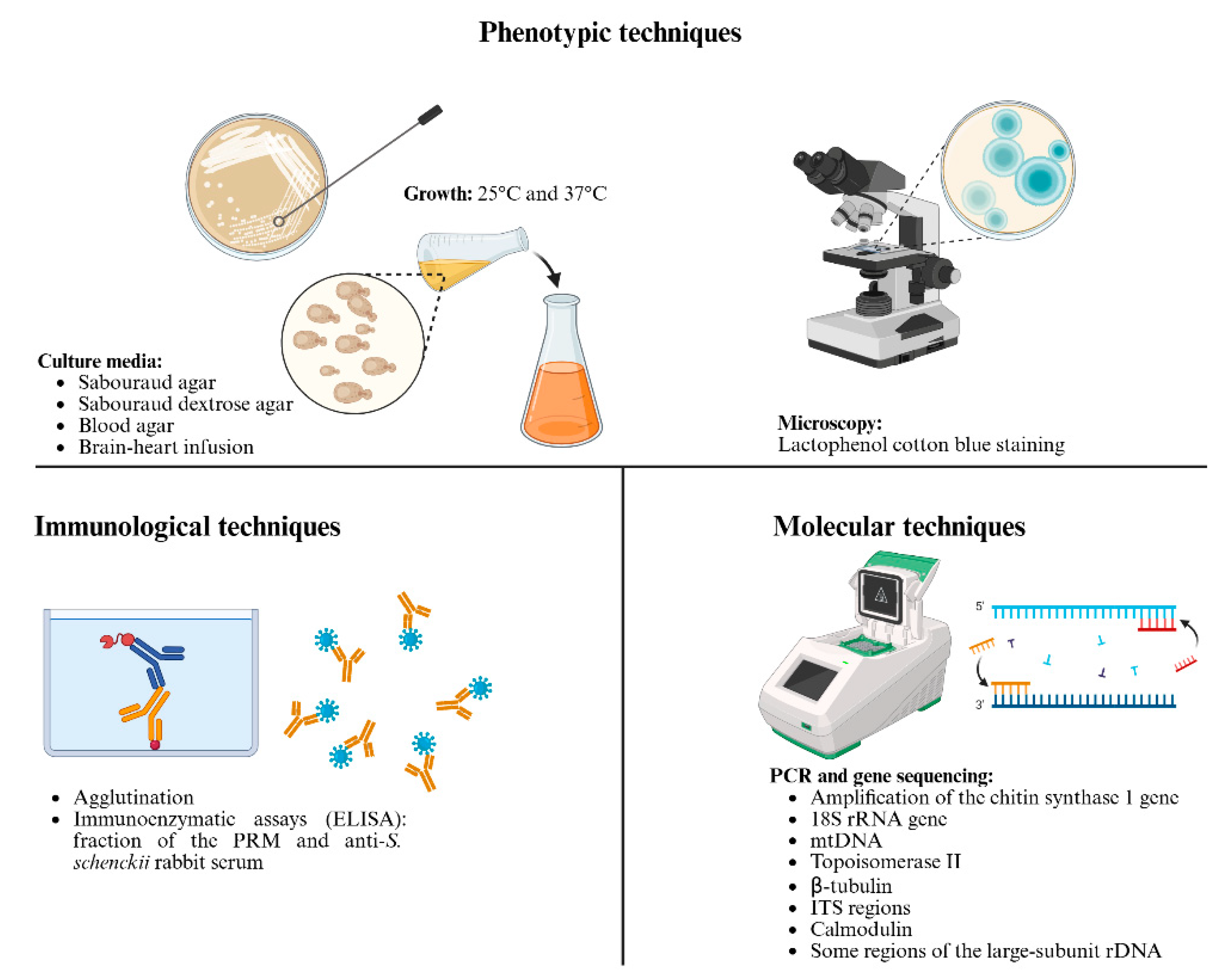 - Tamez-Castrellón, A.K.; Romeo, O.; García-Carnero, L.C.; Lozoya-Pérez, N.E.; Mora-Montes, H.M. Virulence factors in Sporothrix schenckii, one of the causative agents of sporotrichosis. Curr. Protein Pept. Sci. 2020, 21, 295–312. [Google Scholar] [CrossRef]