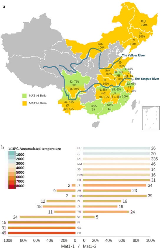 (a) The distribution of rice blast pathogen (Magnaporthe oryzae) collection sites and mating types in 17 provinces of China, where the proportion of green and yellow in a certain province represents the proportion of MAT1-1 and MAT1-2, respectively. (b) The effective accumulated temperature and mating-type distribution of 17 provinces in China where the rice blast pathogen was collected were tested. Different colors represent different effective accumulated temperatures (≥10 °C), with the horizontal axis representing the proportion of two mating types (MAT1-1 and MAT1-2). The number represents the number of isolates of the two mating types, and the vertical axis representing different provinces, including Heilongjiang (HLJ), Jilin (JL), Liaoning (LN), Neimenggu (NMG), Shandong (SD), Jiangsu (JS), Anhui (AH), Zhejiang (ZJ), Jiangxi (JX), Fujian (FJ), Henan (HeN), Hebei (HB), Hunan (HuN), Sichuan (SC), Yunnan (YN), Guangdong (GD) and Guangxi (GX). The gray areas indicate regions not covered in this study.
