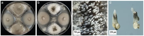 The fertility of M. oryzae was assessed using the cross-culture method. After approximately 25 days of culture, the standard strains P9 (MAT1-1) and P131 (MAT1-2) produced perithecia (Figure 3a), and the same standard strain could not produce perithecia. The growth rates of the mycelium of the two standard strains are basically the same. Some tested isolates generated perithecia under these conditions (Figure 3b). Visible black dot-like bands formed at the mycelial intersection. Stereomicroscope observations further revealed numerous perithecia with translucent hairy tops at the mycelial intersection. The perithecia were semi-embedded in the medium surface, and mature perithecia exhibited long beaks protruding from the surface of the medium (Figure 3c,d). These observations confirm the effectiveness of this method for assessing the fertility of M. oryzae.