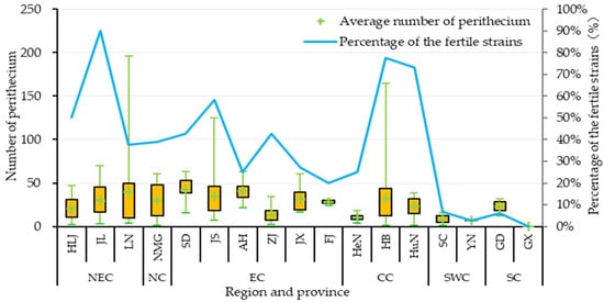 Variations in the fertility of Magnaporthe oryzae across different regions of China. The horizontal axis represents different provinces; the left vertical axis represents the number of perithecia produced by fertile isolates, the “+” in the quartile chart indicates the median; and the right vertical axis shows the percentage of fertile isolates among the tested isolates in the province.