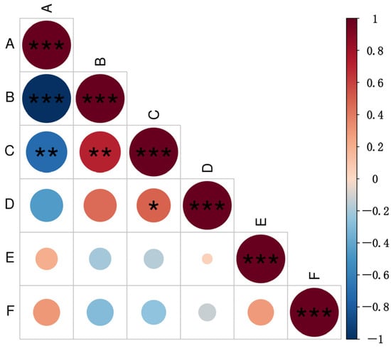 Analysis of correlations between mating type and fertility in Magnaporthe oryzae. A: proportion of the MAT1-1 mating-type; B: proportion of the MAT1-2 mating-type; C: proportion of fertile isolates; D: number of perithecia produced; E: mature perithecium rate; F: ascospore germination rate. The horizontal and vertical intersections indicate the correlation between the two parameters, with the degree of correlation between color depth and circular area meeting the standard. Different shades of red indicate a positive correlation, while different shades of blue indicate a negative correlation. * denotes significance at p < 0.05, ** denotes significance at p < 0.01, and *** denotes significance at p < 0.001.