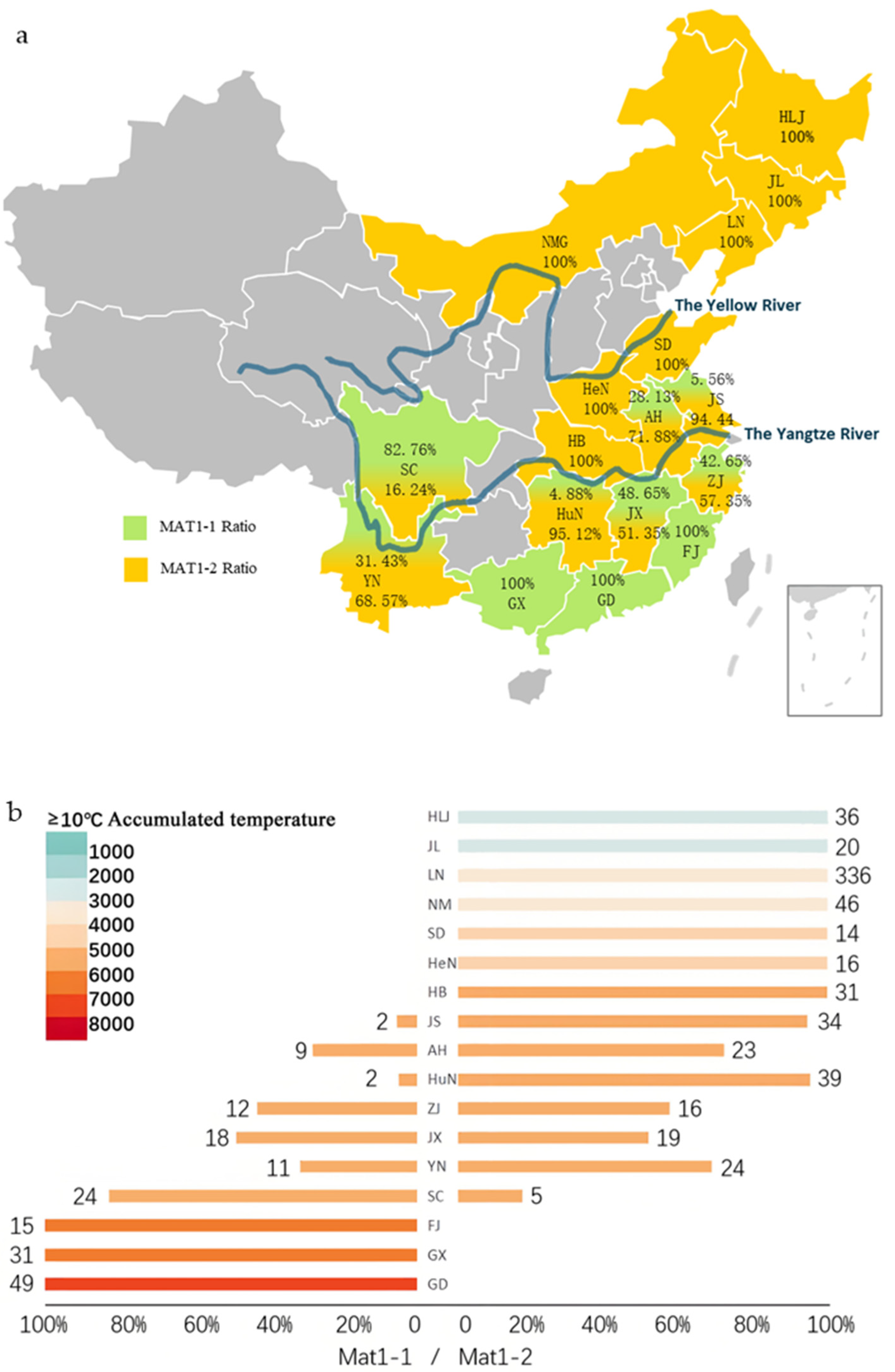 | Region | Province | Accumulated Temperature | No. of Isolates | MAT1-1 | MAT1-2 | ||