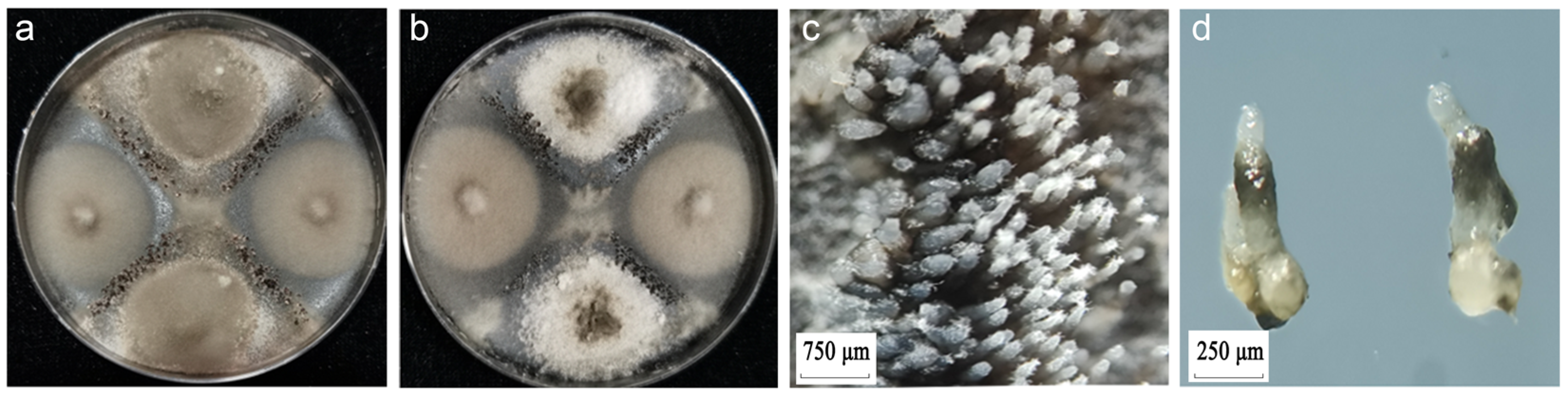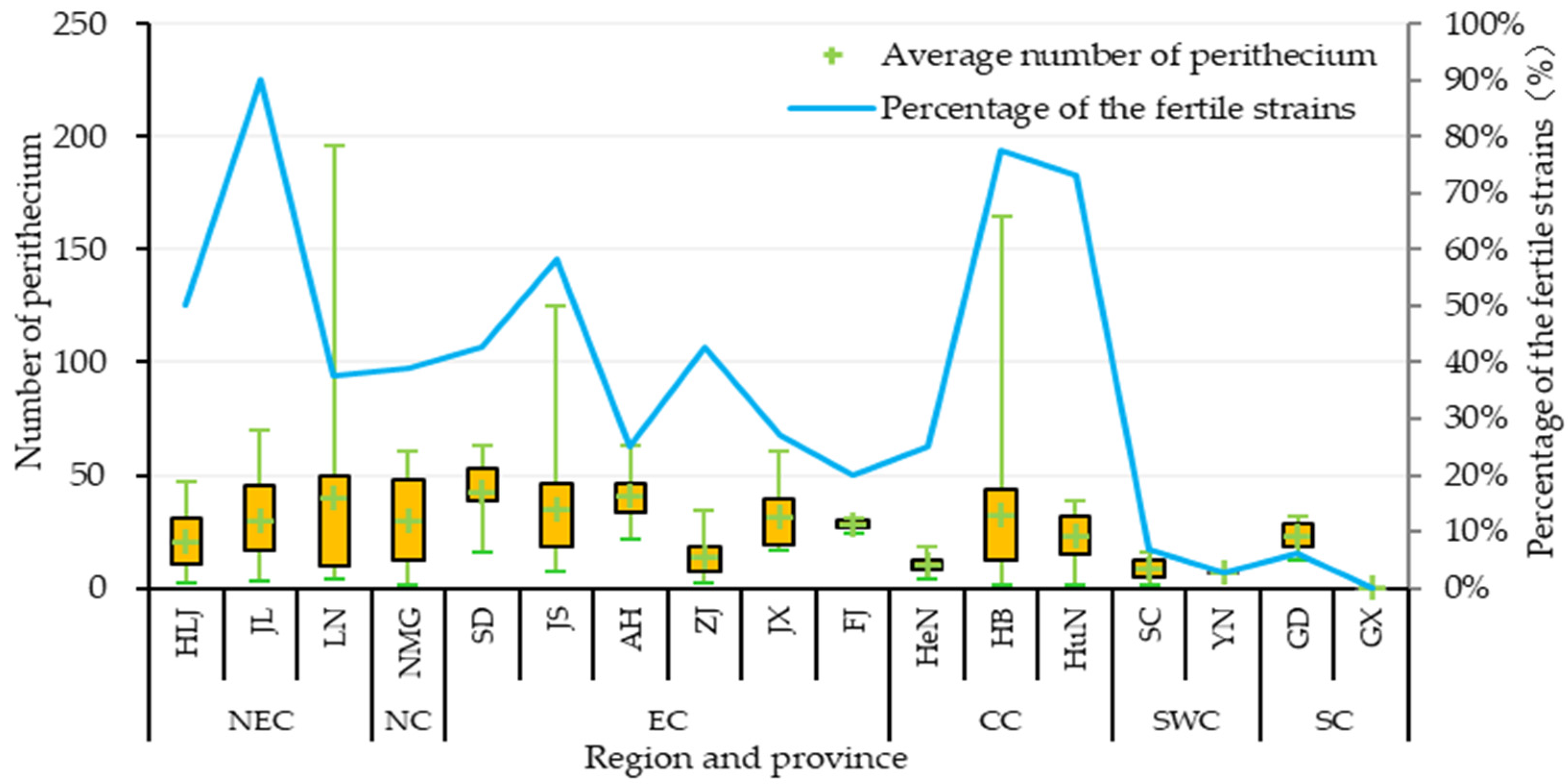 | Region | Province | No. of Isolates | Fertile Isolates | Perithecia | Mature Perithecium Rate | Spore Germination Rate | ||||