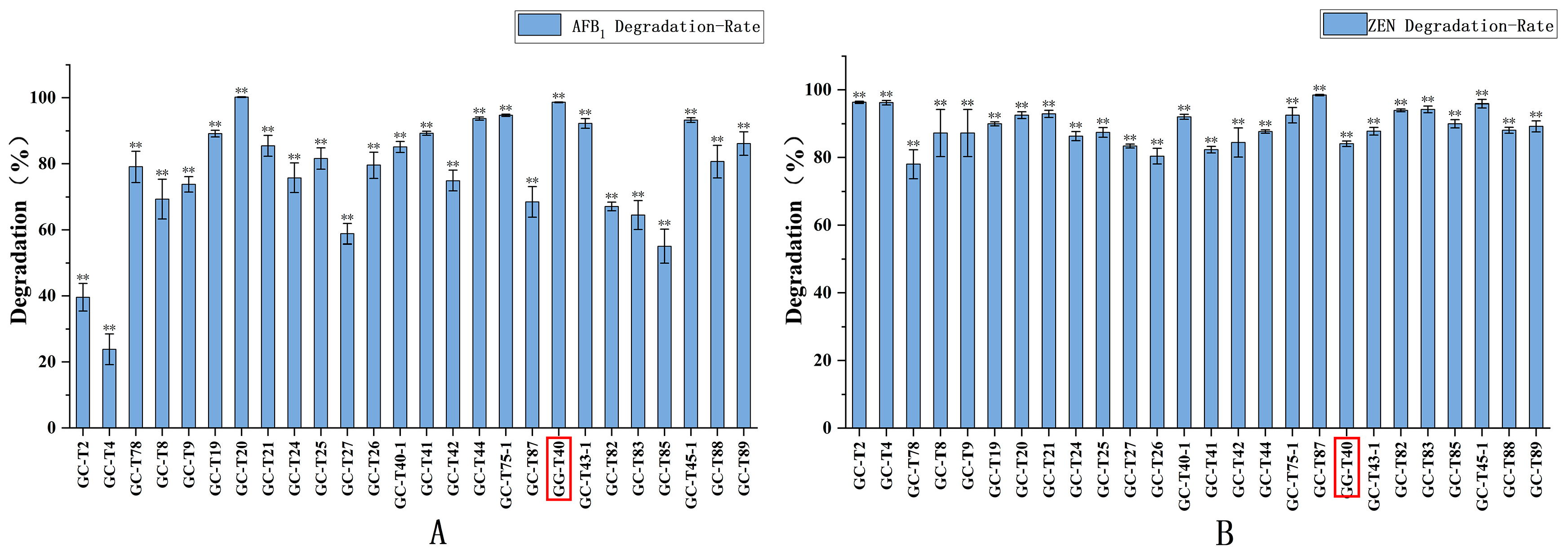 - Elucidating the Molecular Basis and Regulatory Networks of the Degradation Mechanism: Applying multi-omics technologies to analyze the expression and regulatory networks of key genes involved in T. reesei GG-T40’s degradation of AFB1 and ZEN, clarifying the molecular basis of its efficient and simultaneous degradation, and providing a foundation for genetic improvement of the strain.