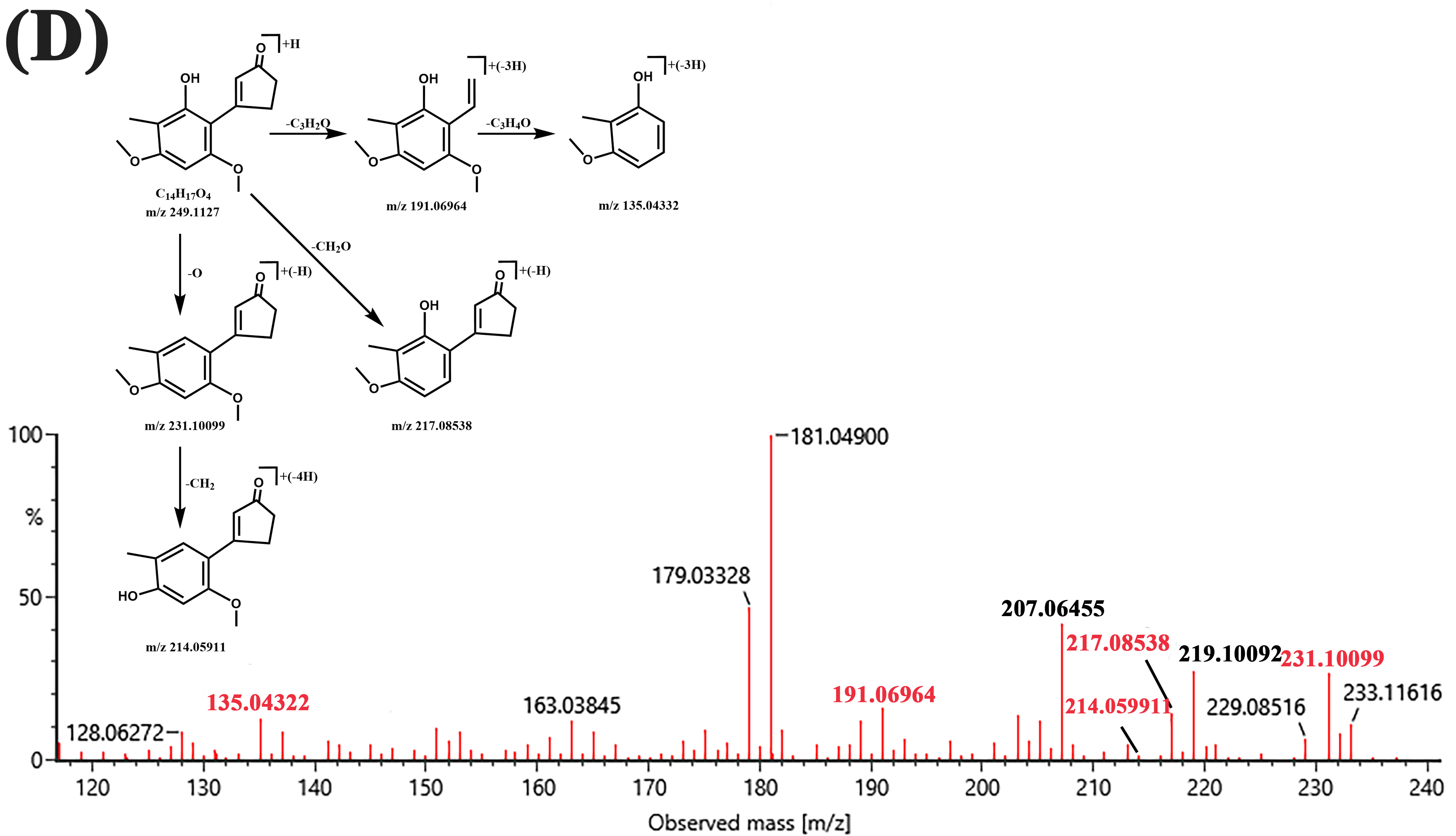 | D | 7.665 | C14H17O4 | 249.1127 | 249.1151 | 2.4 | 9.6 | 6.5 |