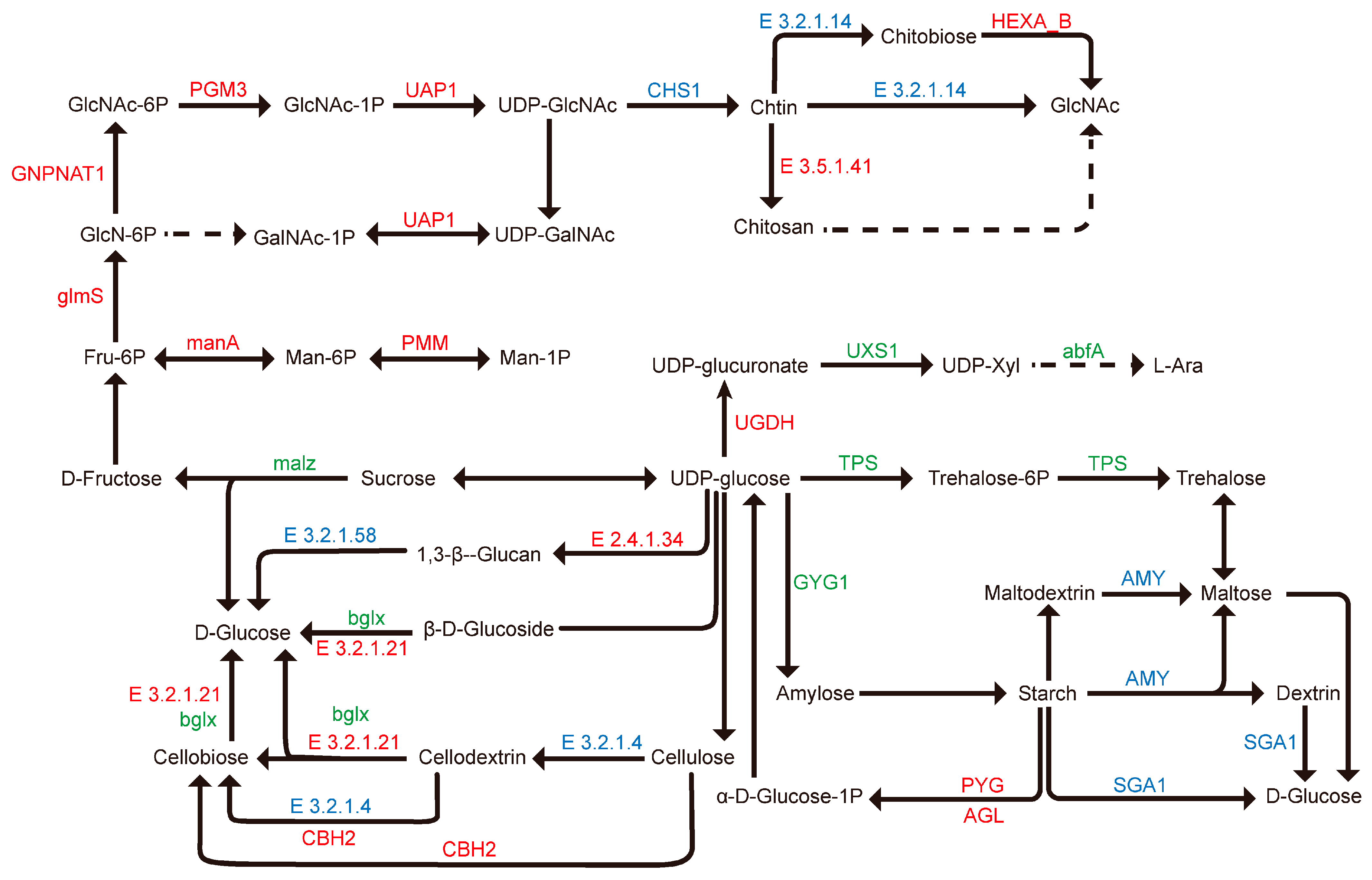 3.2.5. Analysis of Pathways Related to Cell Wall Components