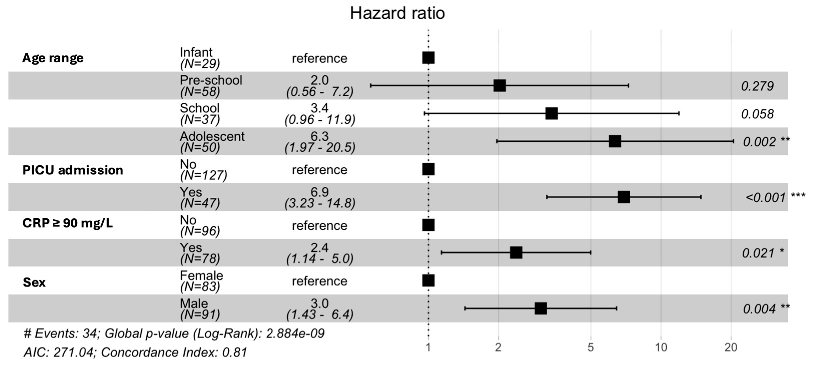| PICU admission | 8.43 | 3.76–19.81 | 10.73 | 4.26–29.47 | 10.65 | 4.35–29.28 |