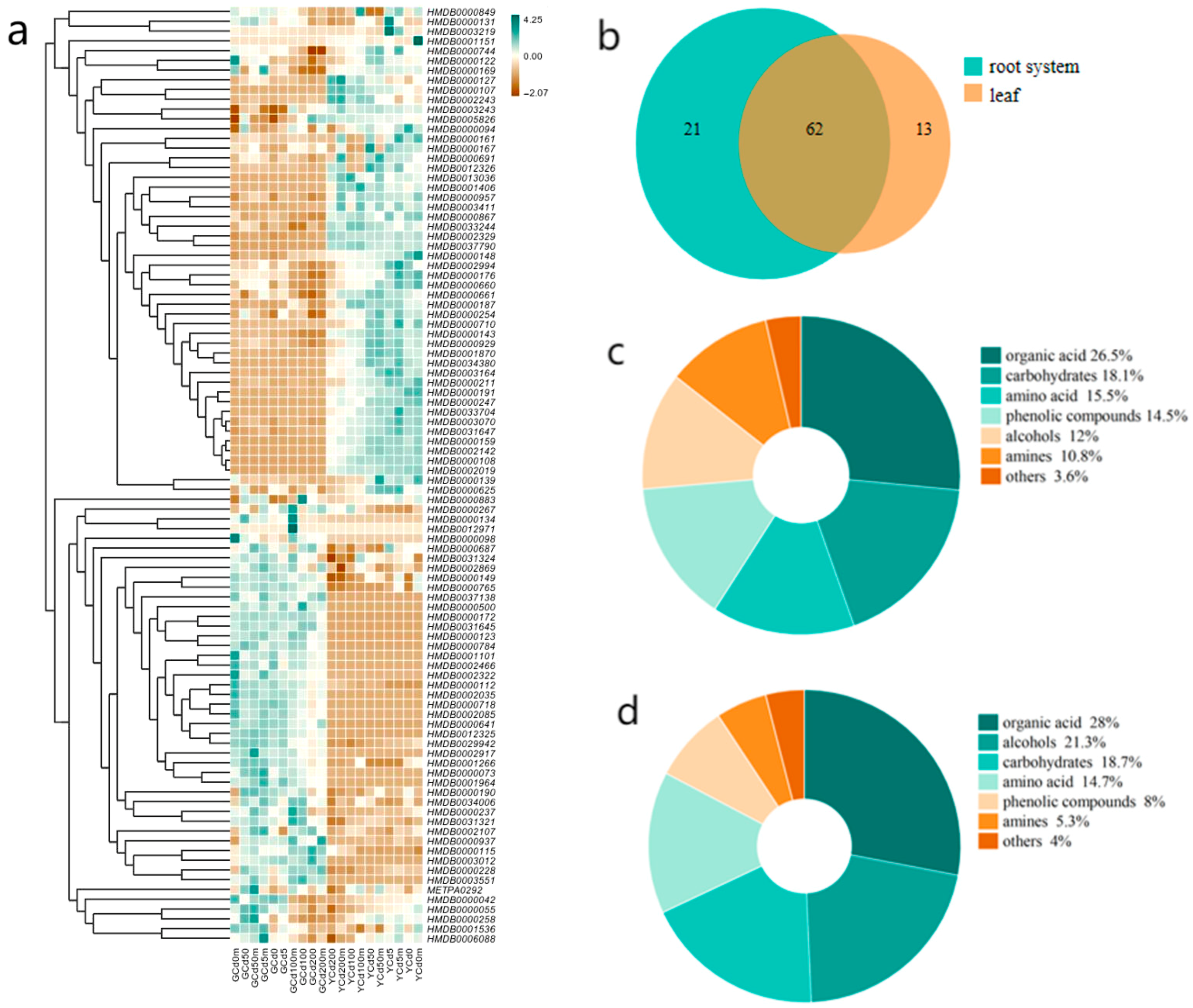 - Wang, Y.; Xu, L.; Shen, H.; Wang, J.; Liu, W.; Zhu, X.; Wang, R.; Sun, X.; Liu, L. Metabolomic Analysis with GC-MS to Reveal Potential Metabolites and Biological Pathways Involved in Pb & Cd Stress Response of Radish Roots. Sci. Rep. 2015, 5, 18296. [Google Scholar] [CrossRef]