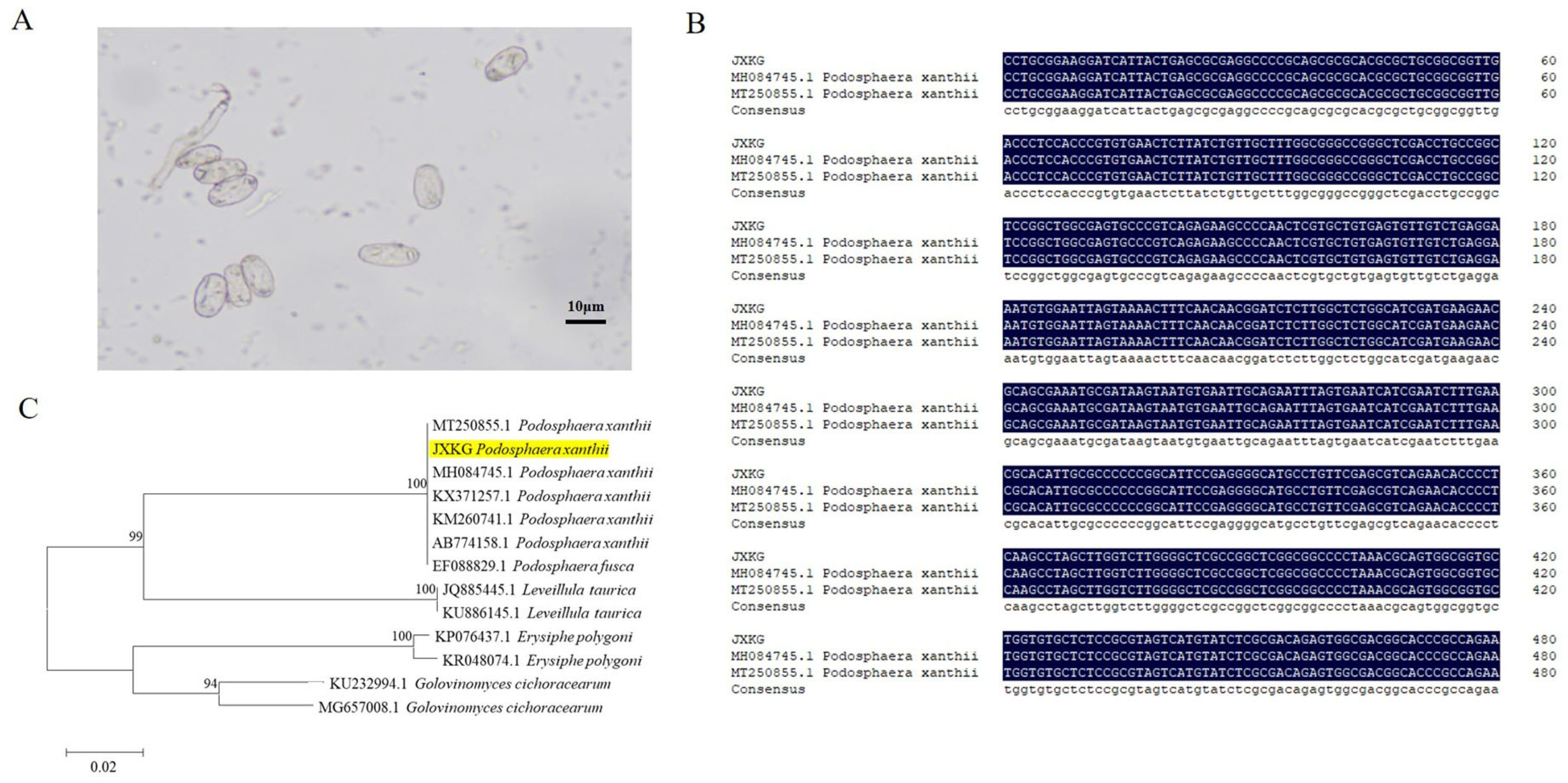2.1. Identification and Phylogenetic Analysis of PM Pathogen