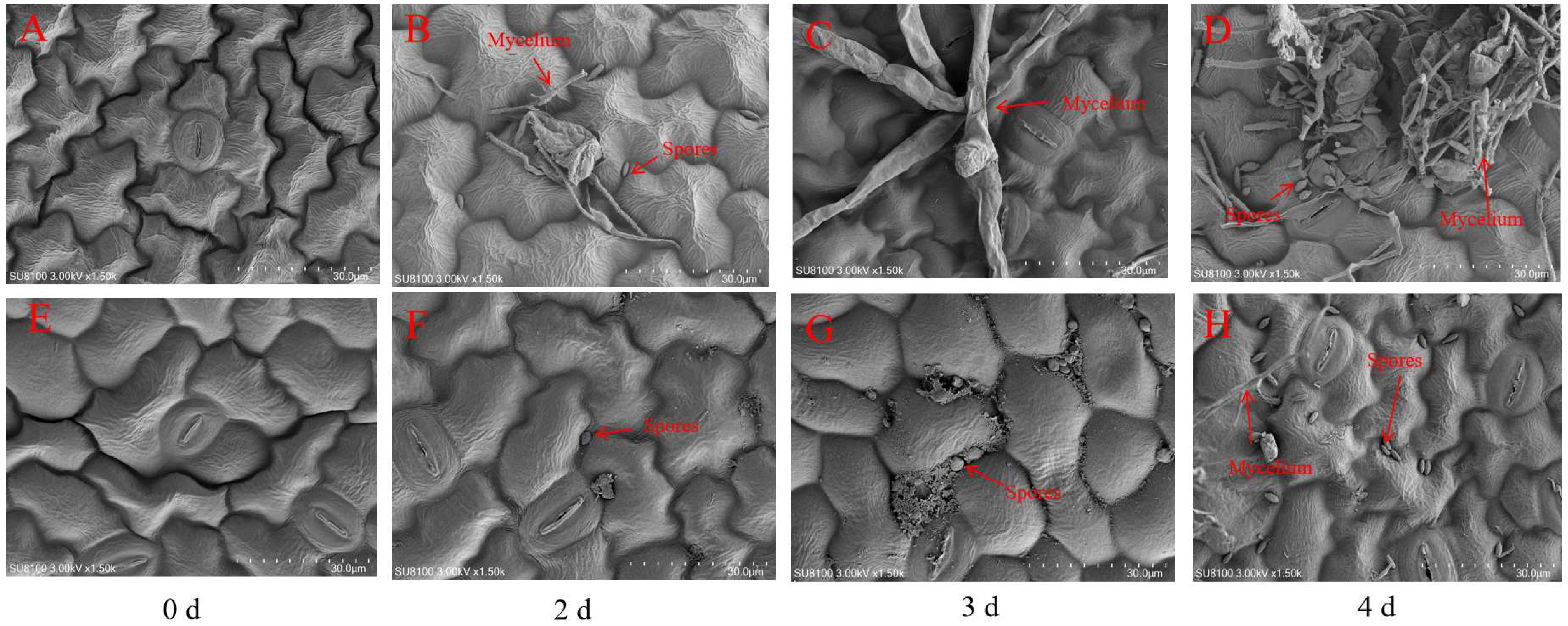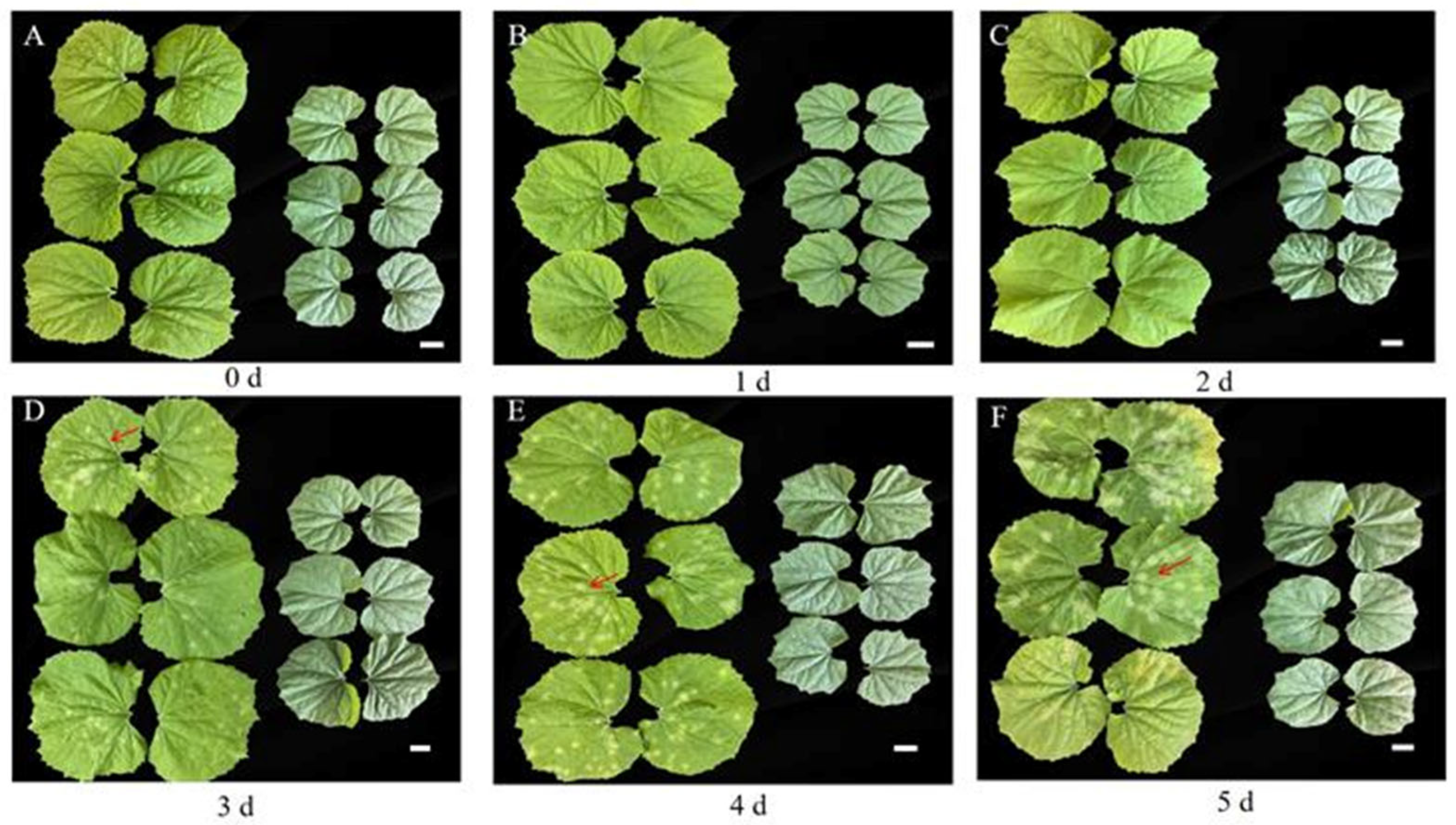3.2. Phenotypic Changes and Microscopic Observation in Bitter Gourd Leaves After P. xanthii Infection
