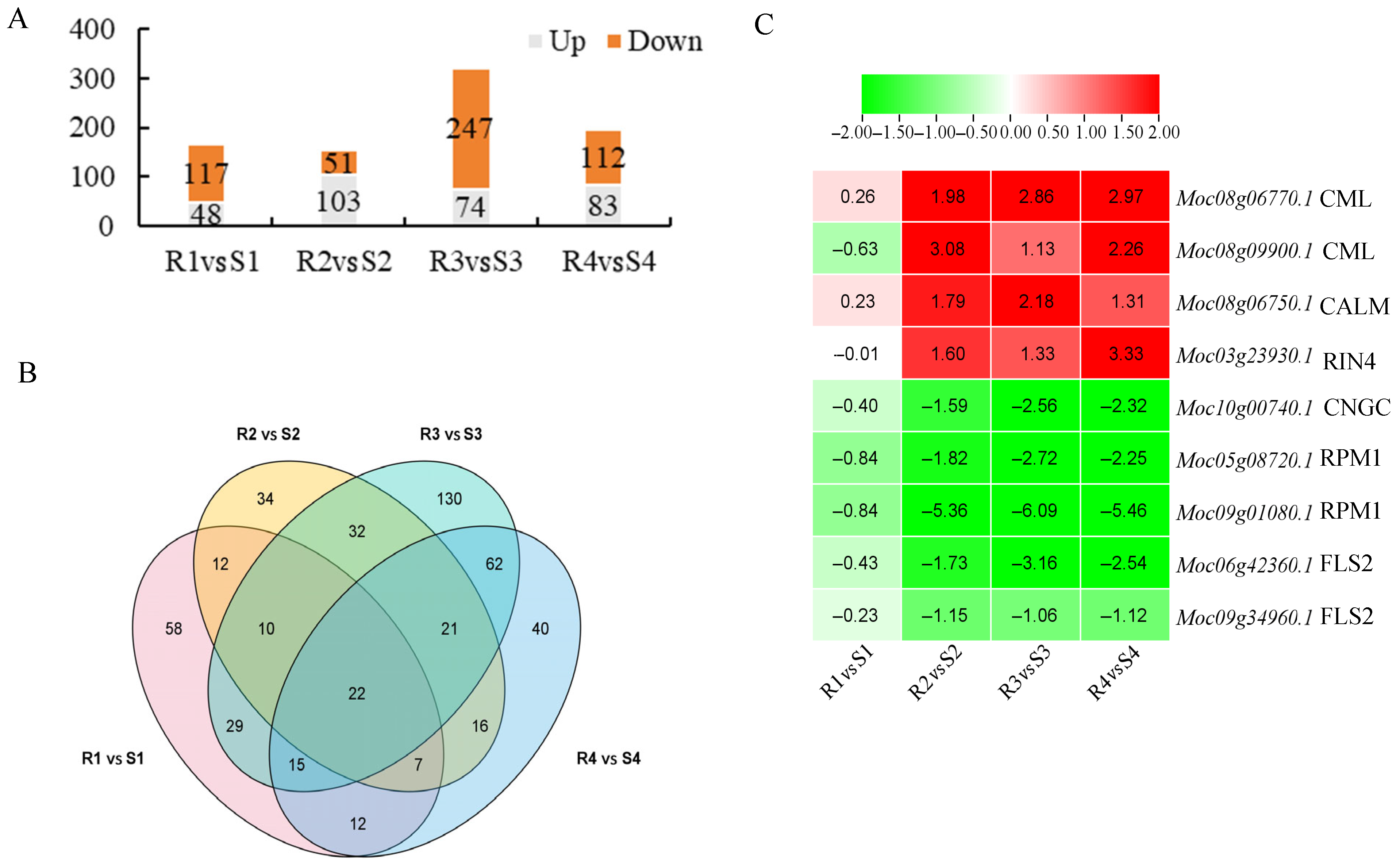 - Zhang, Y.; Dong, W.; Zhao, C.; Ma, H. Comparative Transcriptome analysis of resistant and susceptible Kentucky bluegrass varieties in response to powdery mildew infection. BMC Plant Biol. 2022, 22, 509. [Google Scholar] [CrossRef]