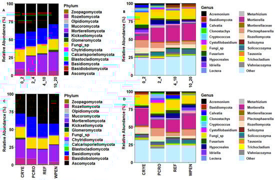 Relative abundance of soil fungal communities at phylum and genus levels in relation to soil depth (A,B) and cover crop treatments (C,D). CRYE (cereal rye), PCRO (a mixture of pea, crimson clover, radish, and oat), REF (winter fallow reference), and WPEN (wild pennycress).