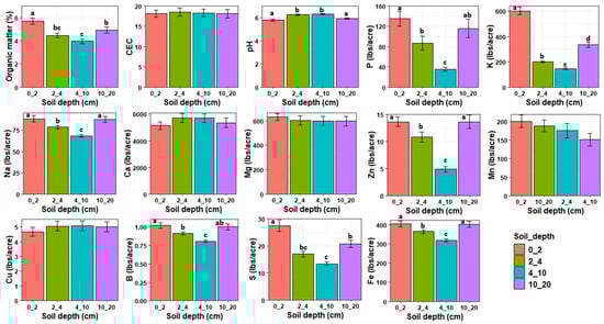 Means (±SE) of the soil physical and chemical properties in relation to soil depth across all treatments. Different letters indicate significant differences and bars without letters are not statistically significant. Values are either in pounds/acre (lbs/acre) or in percentage per kilogram of soil except for CEC whose values are in meq/100 g soil.