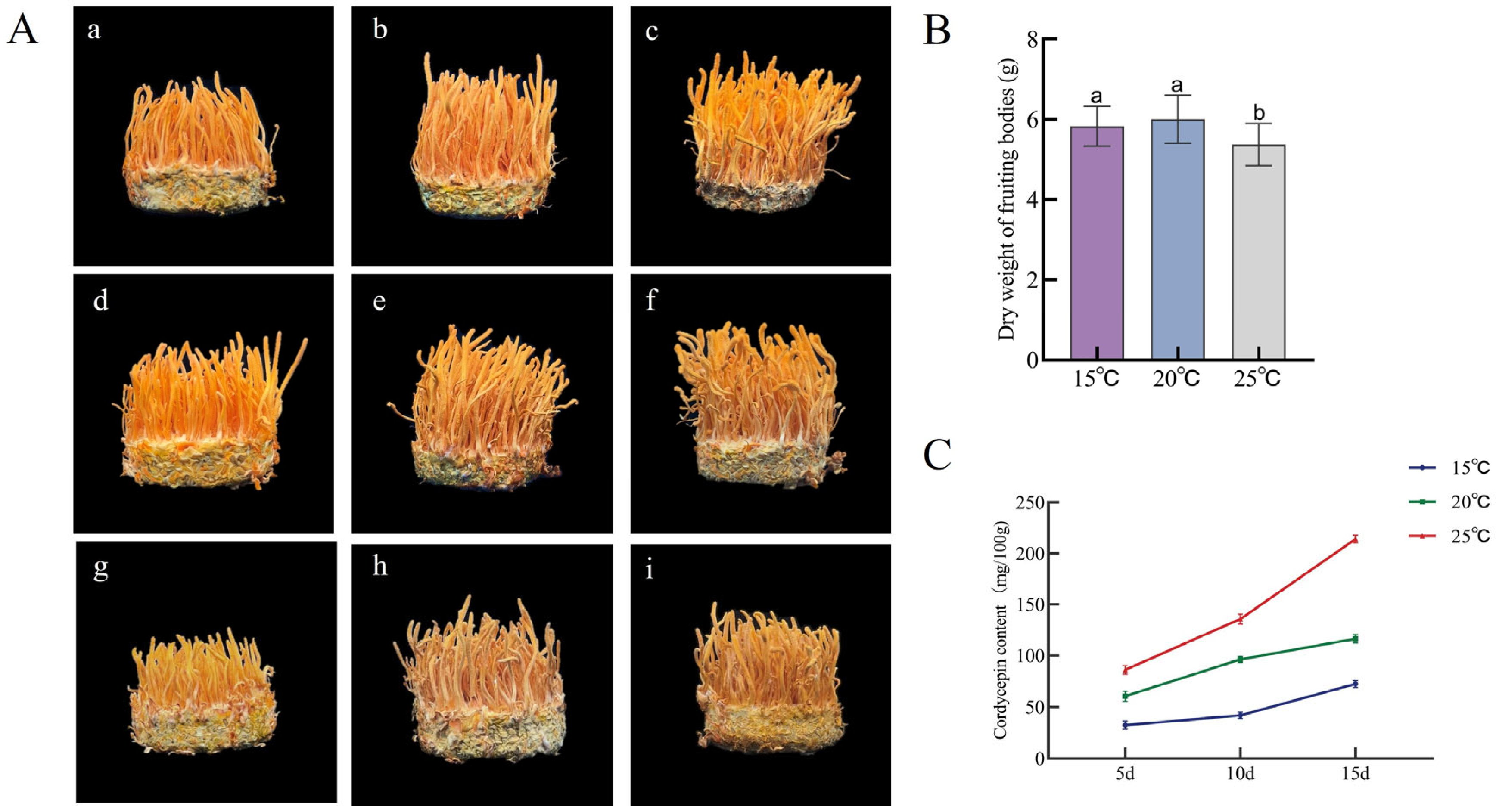 Compared with the control group (20 °C), the fruiting body yield, color, and cordycepin content of