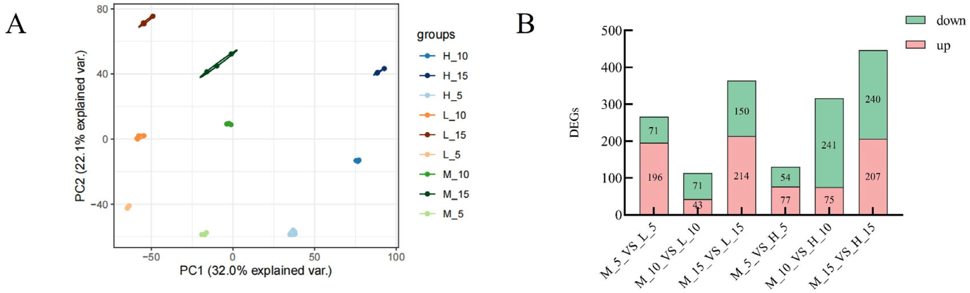 2 FC| > 1 and Q value < 0.05 after false discovery rate correction via the Benjamini–Hochberg method. Genes were compared under different temperature treatments at the same stage to reveal the expression characteristics of genes in response to temperature changes. Under low-temperature treatment, the number of DEGs increased with prolonged treatment duration. A total of 267 DEGs (196 upregulated, 71 downregulated) were identified in the M_5 VS L_5 comparison group, 114 DEGs (43 upregulated, 71 downregulated) in the M_10 VS L_10 comparison group, and 364 DEGs (214 upregulated, 150 downregulated) in the M_15 VS L_15 comparison group. Under high-temperature treatment, the number of DEGs also increased with extended treatment time. The M_5 VS H_5 comparison group yielded 131 DEGs (77 upregulated, 54 downregulated), the M_10 VS H_10 group 316 DEGs (75 upregulated, 241 downregulated), and the M_15 VS H_15 group 447 DEGs (207 upregulated, 240 downregulated). Given the focus on temperature-induced changes in gene expression, a non-redundant statistical approach was applied to analyze DEGs across different time points under various temperature treatments. A total of 1070 unique DEGs were identified across the six comparison groups. Specifically, 633 DEGs were detected in the M_ VS _L group, while 664 DEGs were found in the M_ VS _H group, indicating that high-temperature treatment elicits a more pronounced transcriptional response. Further comparison revealed 406 and 437 DEGs that were uniquely differentially expressed under low-temperature and high-temperature stress, respectively. Additionally, 227 genes exhibited differential expression under both temperature stress conditions, suggesting the coexistence of temperature-specific regulatory mechanisms and universal stress response pathways. The statistics of DEGs among different groups are presented in