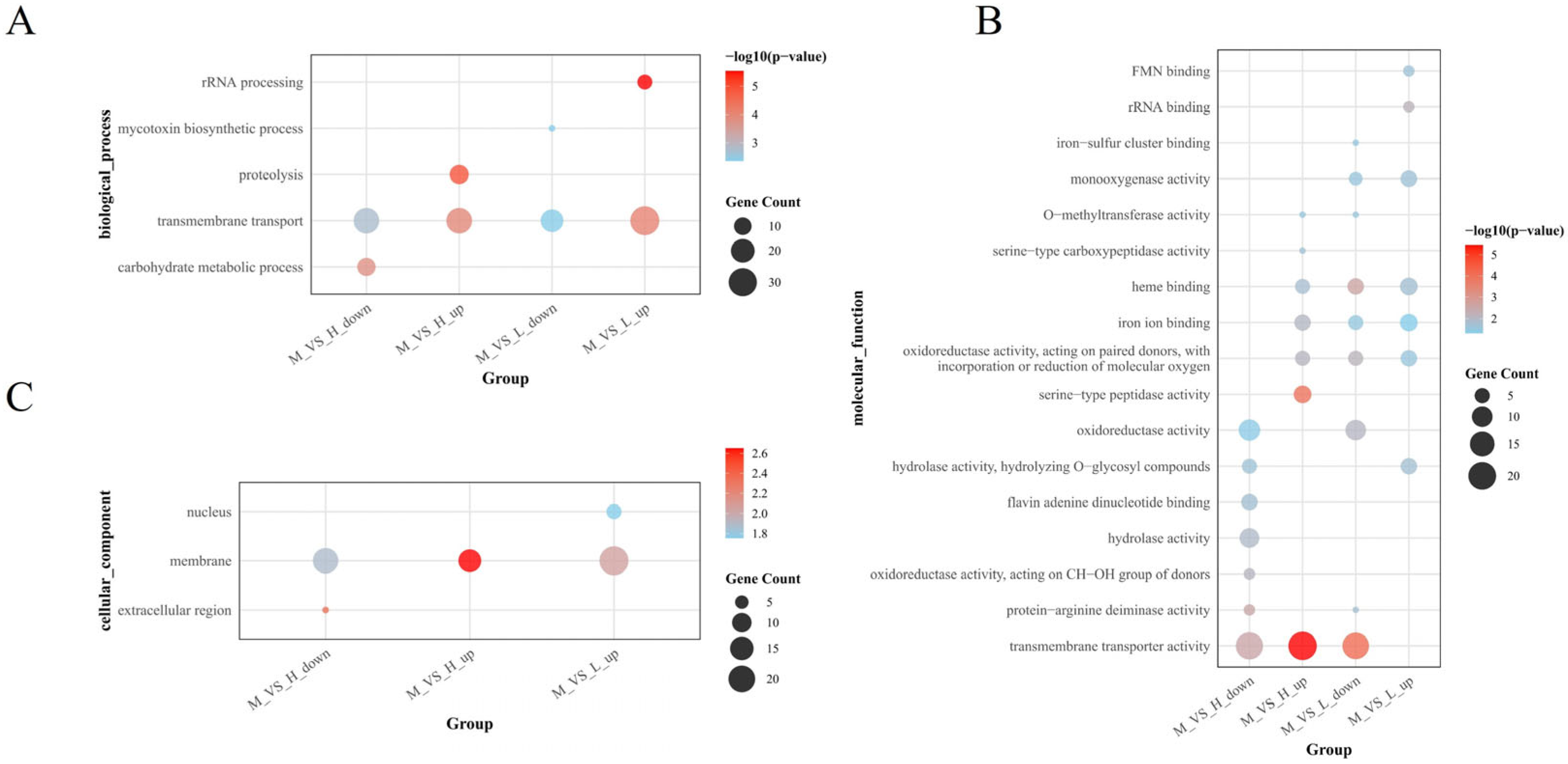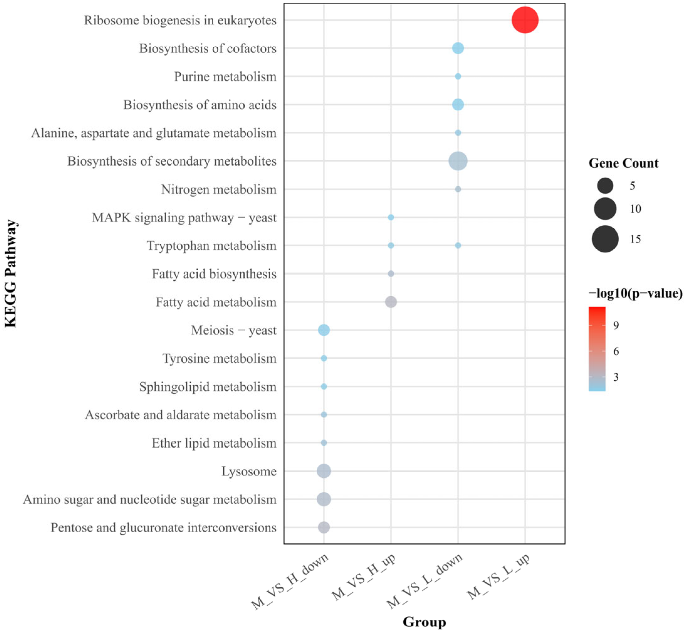 Figure 4). In the M_VS_H comparison group, DEGs were significantly enriched in pathways including pentose and glucuronate interconversions, fatty acid metabolism, amino sugar and nucleotide sugar metabolism, and fatty acid biosynthesis. In the M_VS_L comparison group, DEGs were significantly enriched in ribosome biogenesis in eukaryotes, nitrogen metabolism, biosynthesis of secondary metabolites, and alanine, aspartate and glutamate metabolism. KEGG enrichment analysis showed that membrane-related fatty acid metabolism and fatty acid biosynthesis pathways were significantly upregulated in the M_VS_H group, whereas these two pathways were not significantly enriched in the M_VS_L group. Fatty acid metabolism and fatty acid biosynthesis can directly regulate the composition and structural stability of cell membrane lipids, and changes in membrane lipid properties are key factors affecting transmembrane substance transport [