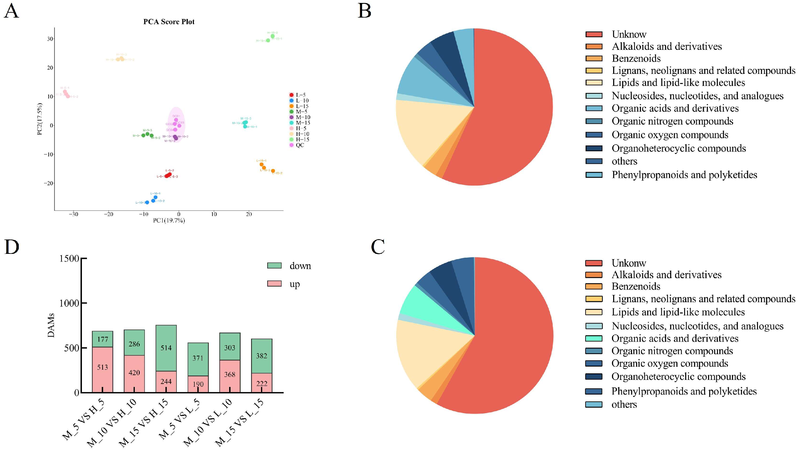 A 6 mL aliquot of the liquid seed culture of Cordyceps militaris was inoculated into the cultivation medium and incubated at 20 °C in the dark for 10 d until the mycelium fully covered the medium surface. Subsequently, the culture was exposed to 1200 lx light to induced mycelial color transformation, which was completed after 14 d of total incubation. Primordia emerged on the surface of culture at 20 d post-incubation. Following 27 d of initial cultivation, the cultures were transferred to three temperature conditions for further fruiting body development: low temperature (15 °C), control (20 °C), and high temperature (25 °C). During the temperature treatment phase, the cultures were maintained under 1200 lx light and 80–90% ambient humidity. Fruiting bodies were harvested on 5 d, 10 d, and 15 d post-temperature treatment, corresponding to 32 d, 37 d, and 42 d post-inoculation, respectively. The fruiting bodies cultivated at 15 °C were designated as L-5, L-10, and L-15; those at 20 °C as M-5, M-10, and M-15; and those at 25 °C as H-5, H-10, and H-15.