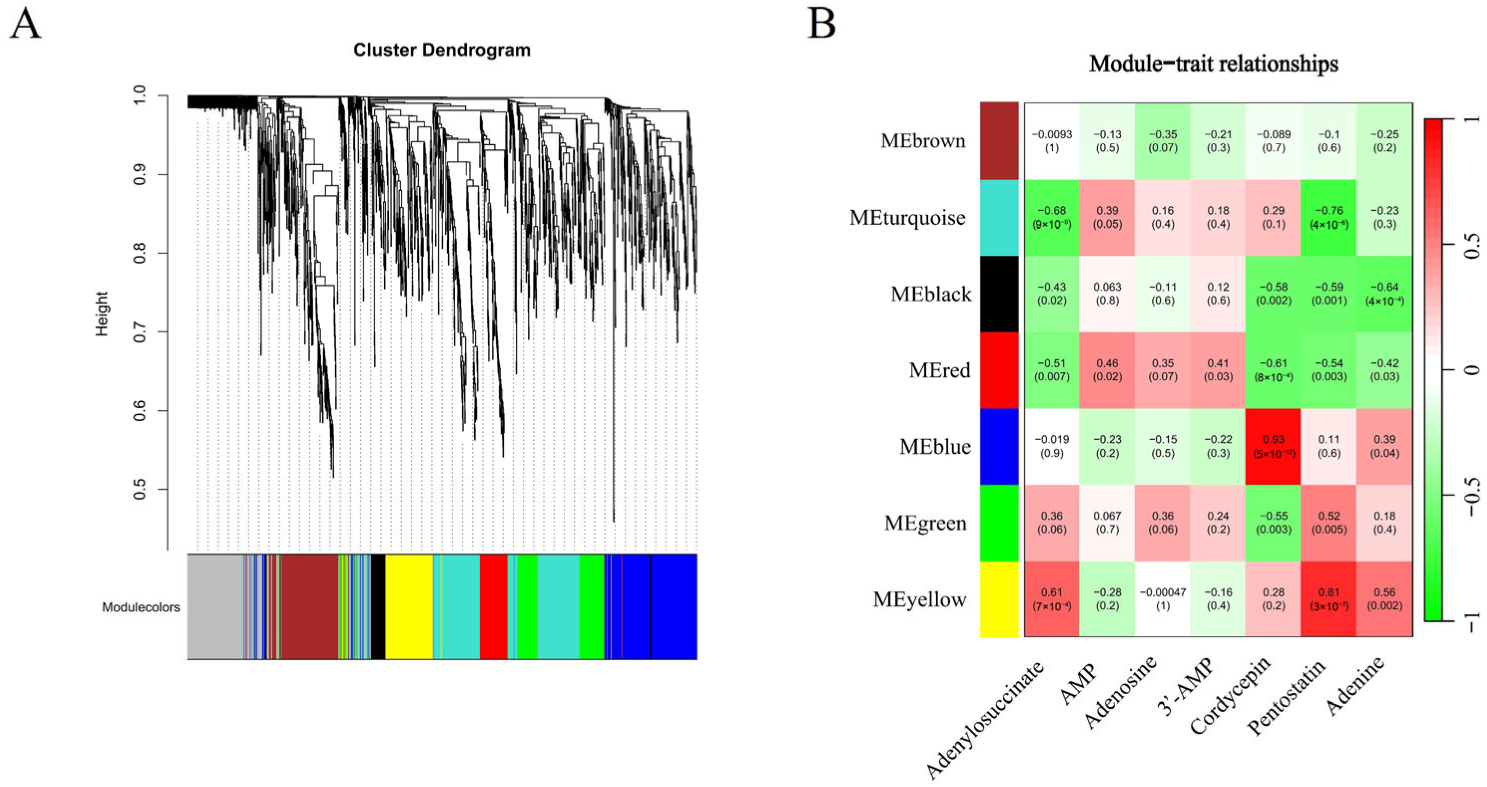Supplementary Table S1: WGCNA modules. The expression pattern of each module was represented by the Module Eigengene (ME), and further correlation analysis was performed between MEs and the phenotypic traits of the samples to identify modules significantly associated with the target traits. In this study, the metabolite contents of the corresponding samples in the cordycepin metabolic pathway were used as phenotypes to calculate the correlation between module genes and metabolites.